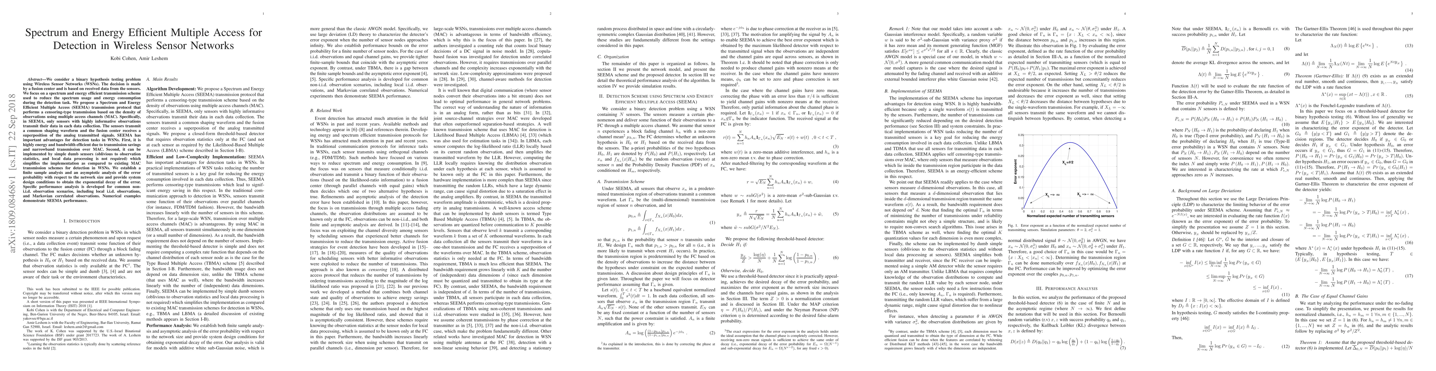 This paper proposes a Spectrum and Energy Efficient Multiple Access (SEEMA) protocol for Wireless Sensor Networks (WSNs) to enhance detection tasks by reducing spectrum usage and energy consumption. SEEMA selectively transmits data from sensors with highly informative observations, achieving energy and bandwidth efficiency while simplifying sensor implementation.