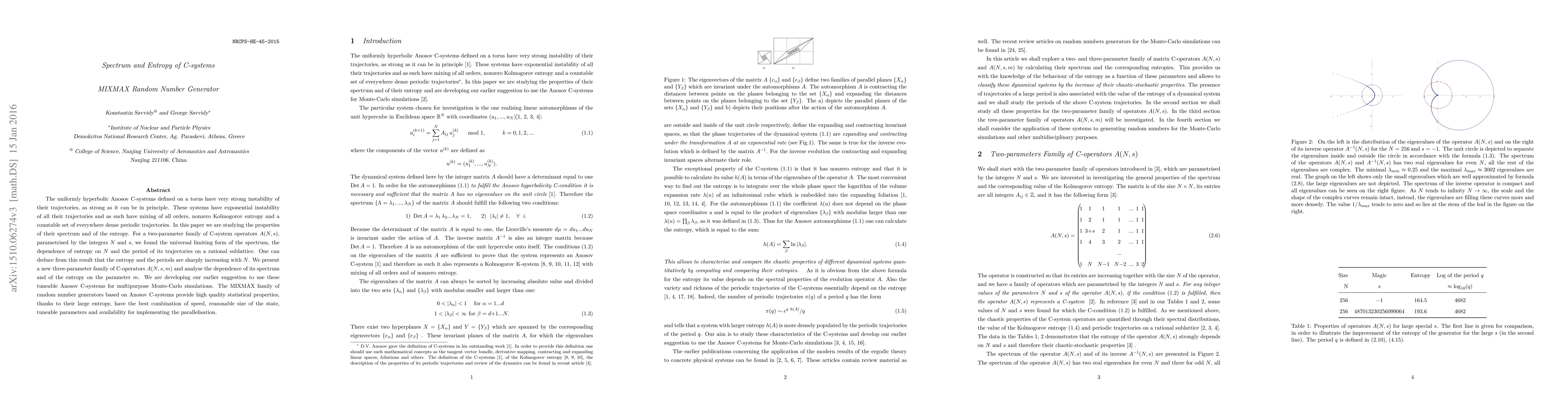 This paper explores the spectrum and entropy properties of uniformly hyperbolic Anosov C-systems on a torus, revealing their strong instability and high entropy. It introduces a new three-parameter family of C-operators and proposes MIXMAX random number generators based on these systems, offering high-quality statistical properties for Monte-Carlo simulations.