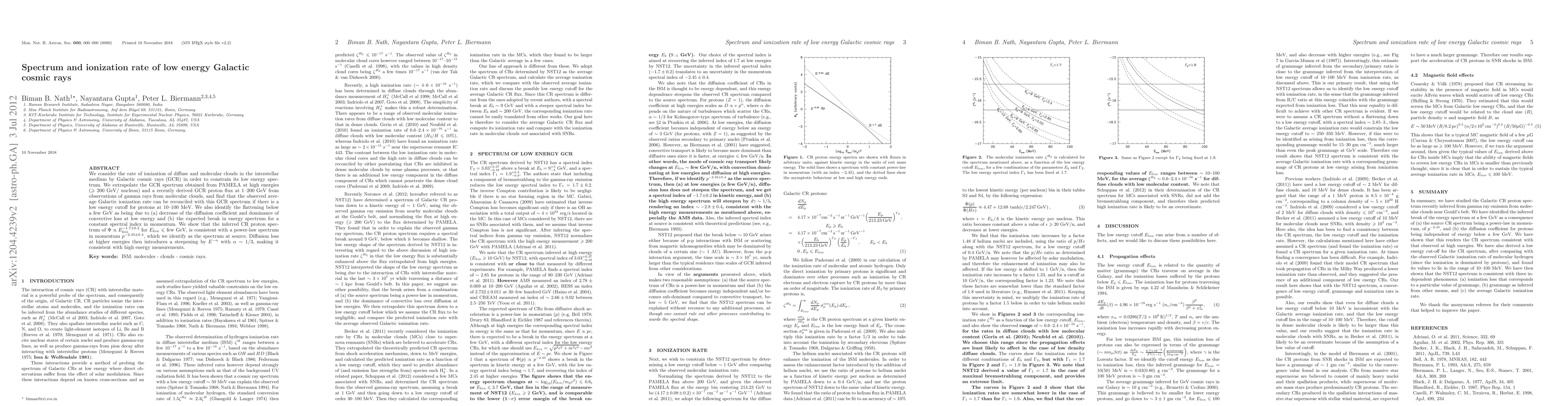 This research identifies a low energy cutoff for protons in Galactic cosmic rays (GCR) at 10-100 MeV, reconciling observed Galactic ionization rates with GCR spectrum. It also explains the flattening of the spectrum below a few GeV through changes in diffusion coefficient, convective losses, and spectral index, supporting a power-law spectrum in momentum at the source.