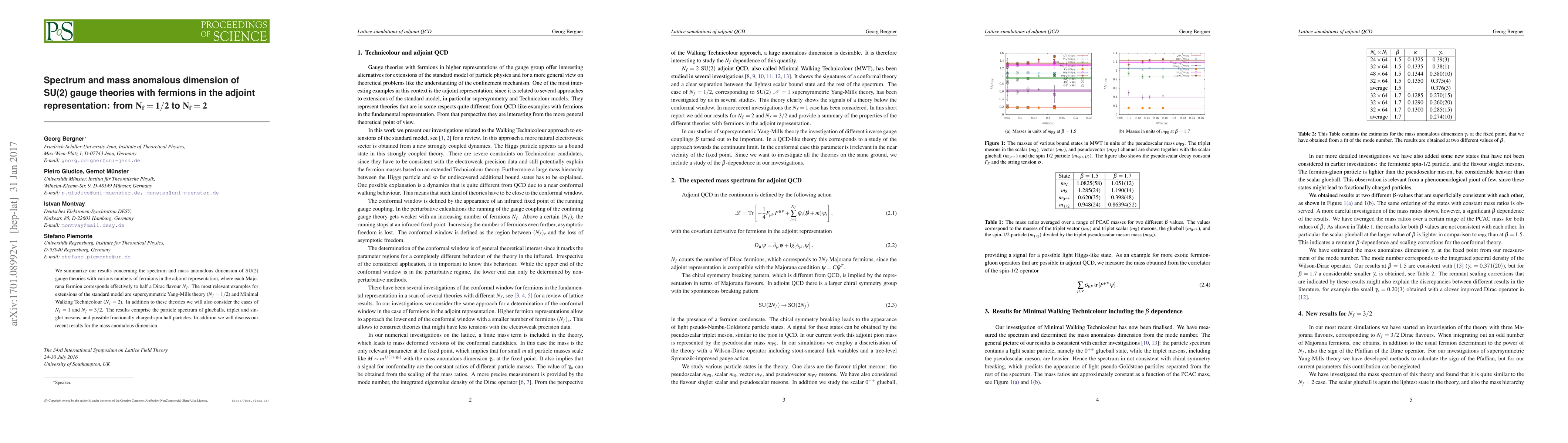 This paper investigates the spectrum and mass anomalous dimension of SU(2) gauge theories with fermions in the adjoint representation, ranging from $N_f=1/2$ to $N_f=2$. It focuses on the theoretical framework for supersymmetric Yang-Mills and Minimal Walking Technicolor, alongside other intermediate cases, detailing the particle spectrum and recent findings on mass anomalous dimensions.