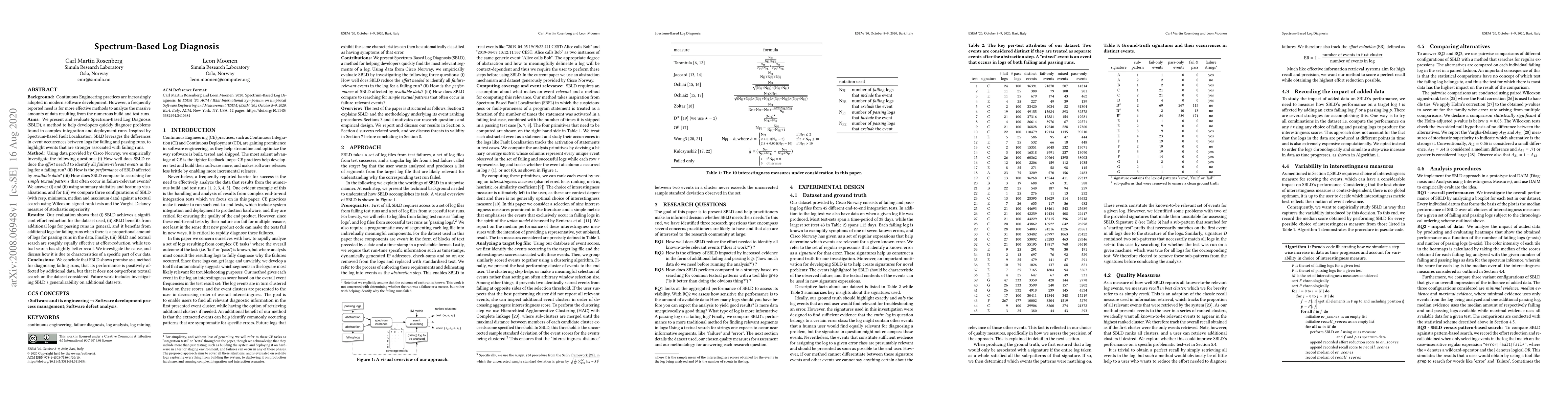Spectrum-Based Log Diagnosis (SBLD) method reduces developer effort in diagnosing complex integration and deployment failures by highlighting relevant events from log differences. SBLD performs similarly to textual pattern search, benefiting from additional log data, but further studies are needed for broader applicability.