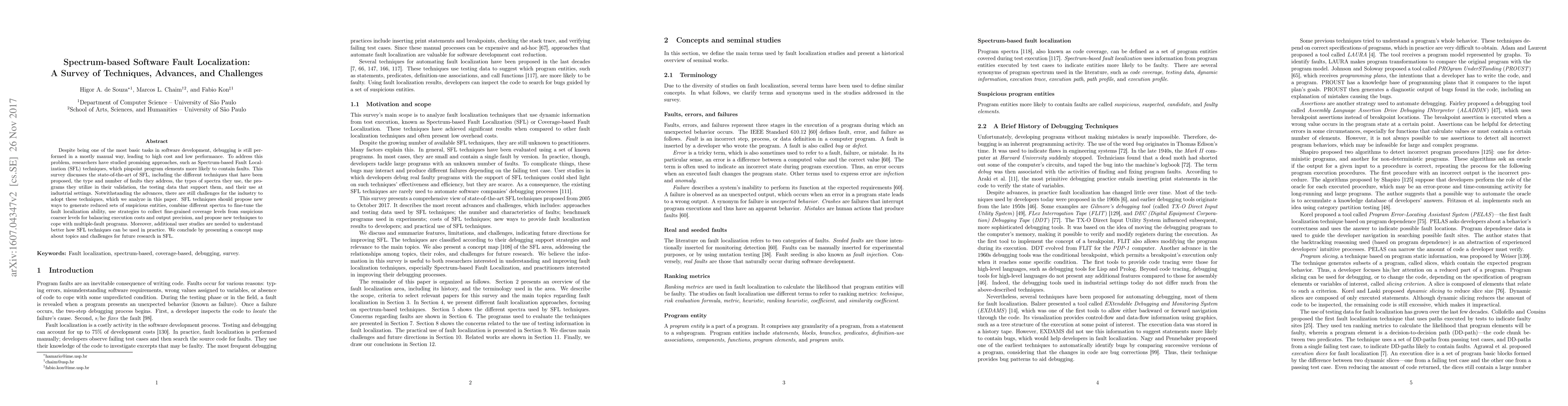 This paper surveys Spectrum-based Fault Localization (SFL) techniques, highlighting advances, challenges, and future directions. It discusses various SFL methods, their effectiveness, and the spectra used, while also identifying key challenges for industrial adoption.