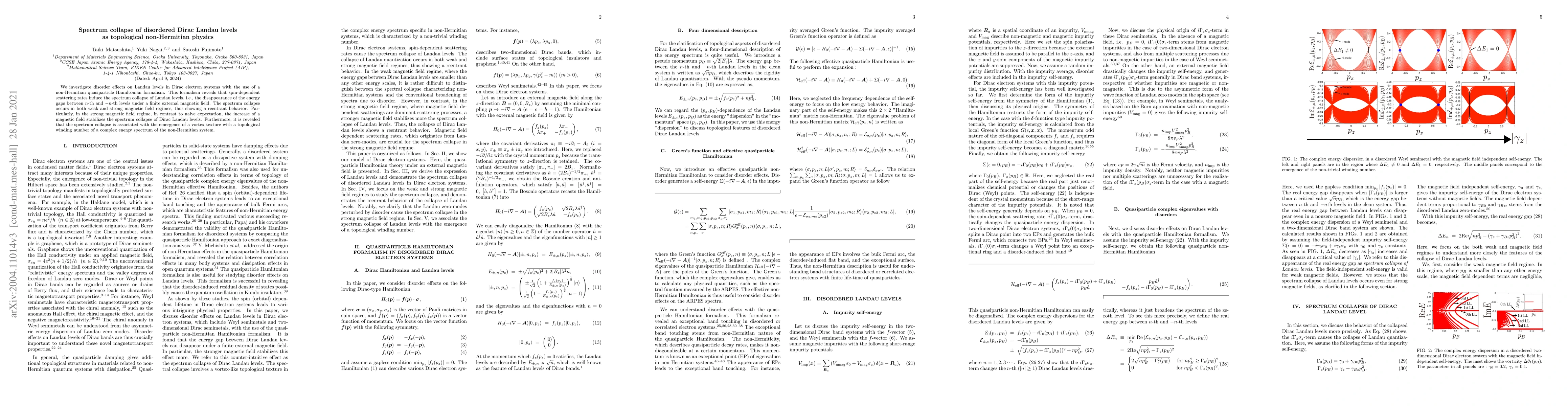 We investigate disorder effects on Landau levels in Dirac electron systems with the use of a non-Hermitian quasiparticle Hamiltonian formalism. This formalism reveals that spin-dependent scattering rates induce the spectrum collapse of Landau levels, i.e., the disappearance of the energy gaps between n-th and -n-th levels under a finite external magnetic field. The spectrum collapse occurs in both weak and strong magnetic field regimes, thus showing a reentrant behavior. Particularly, in the strong magnetic field regime, in contrast to naive expectation, the increase of a magnetic field stabilizes the spectrum collapse of Dirac Landau levels. Furthermore, it is revealed that the spectrum collapse is associated with the emergence of a vortex texture with a topological winding number of a complex energy spectrum of the non-Hermitian system.