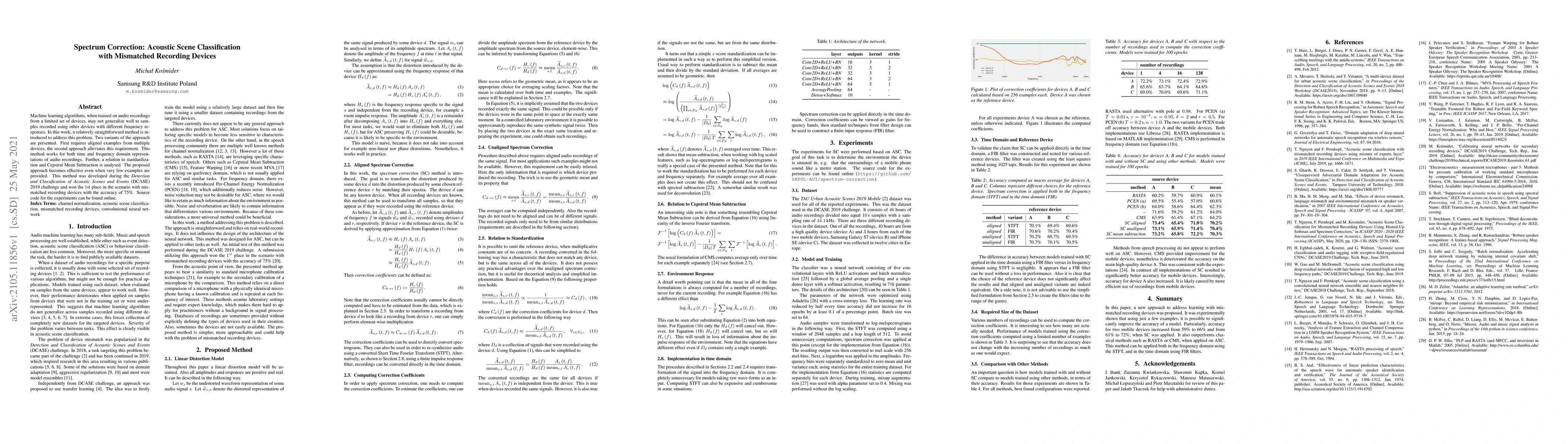 This paper introduces a method to correct spectrum discrepancies in acoustic scene classification when using mismatched recording devices. The proposed approach, which won first place in the DCASE 2019 challenge, includes two variants: one requiring aligned examples and another that does not, and it works for both time and frequency domain representations.