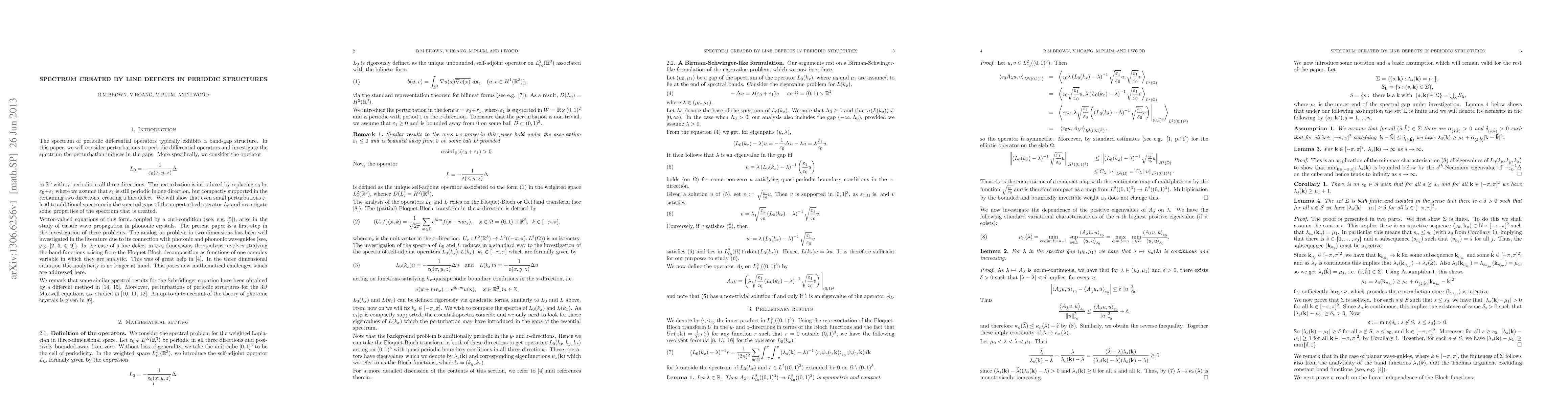The spectrum of periodic differential operators typically exhibits a band-gap structure. In this paper, we will consider perturbations to periodic differential operators and investigate the spectrum the perturbation induces in the gaps. More specifically, we consider the operator $$ L_0 =-\frac{1}{\eps_0(x,y,z)}\Delta $$ in $\R^3$ with $\eps_0$ periodic in all three directions. The perturbation is introduced by replacing $\eps_0$ by $\eps_0+\eps_1$ where we assume that $\eps_1$ is still periodic in one direction, but compactly supported in the remaining two directions, creating a line defect. We will show that even small perturbations $\eps_1$ lead to additional spectrum in the spectral gaps of the unperturbed operator $L_0$ and investigate some properties of the spectrum that is created.