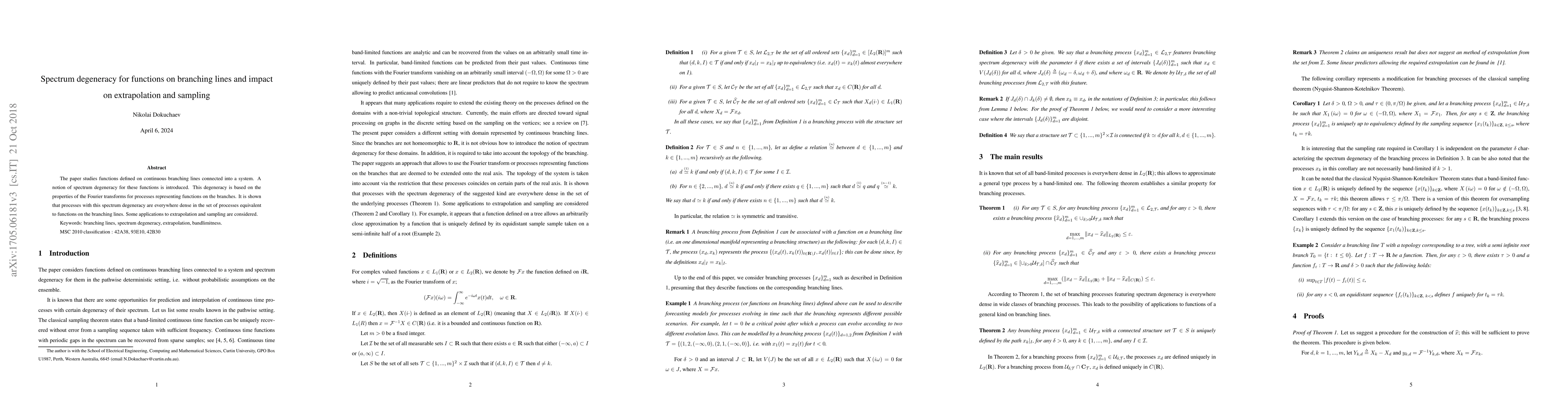 The paper studies functions defined on continuous branching lines connected into a system. A notion of spectrum degeneracy for these functions is introduced. This degeneracy is based on the properties of the Fourier transforms for processes representing functions on the branches. It is shown that processes with this spectrum degeneracy are everywhere dense in the set of processes equivalent to functions on the branching lines. Some applications to extrapolation and sampling are considered.