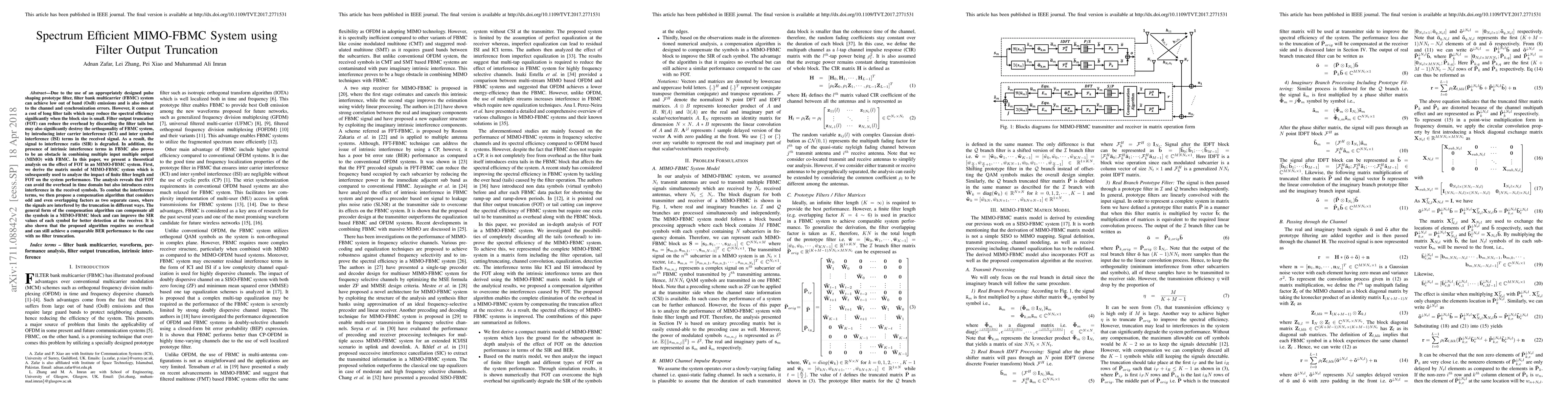 This paper investigates the impact of filter output truncation (FOT) on the spectral efficiency of MIMO-FBMC systems, revealing that while FOT reduces overhead, it introduces inter-carrier and inter-symbol interference. To mitigate these effects, the authors propose a compensation algorithm that improves signal-to-interference ratio (SIR) and maintains comparable bit error rate (BER) performance without additional overhead.
