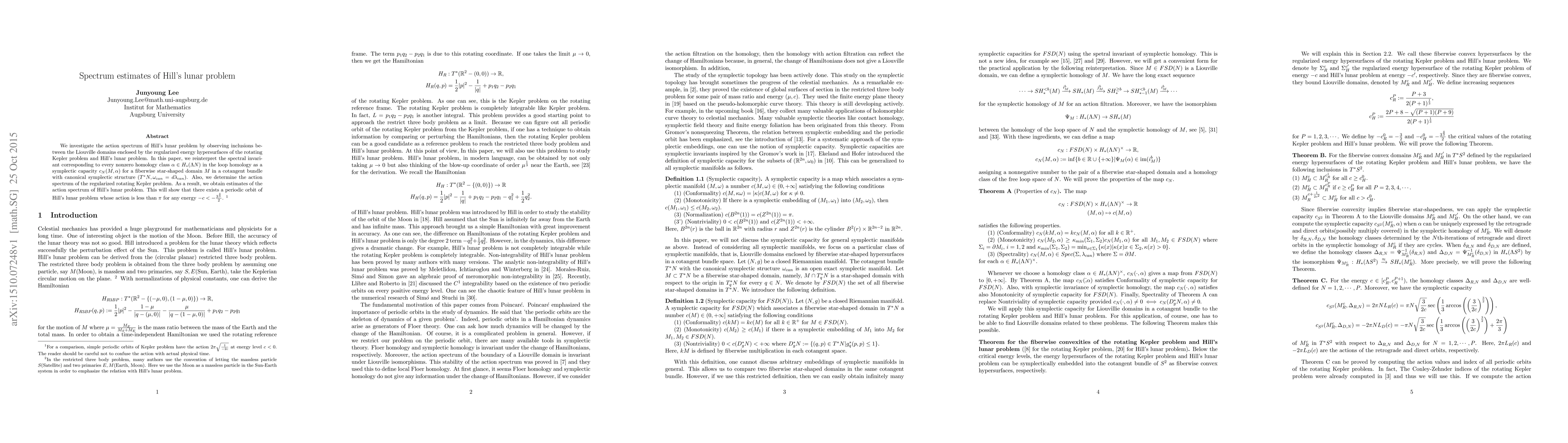 This paper reinterprets the spectral invariant of Hill's lunar problem as a symplectic capacity, providing estimates of the action spectrum and demonstrating the existence of periodic orbits with actions less than $\pi$ for specific energies. The study also determines the action spectrum for the regularized rotating Kepler problem.