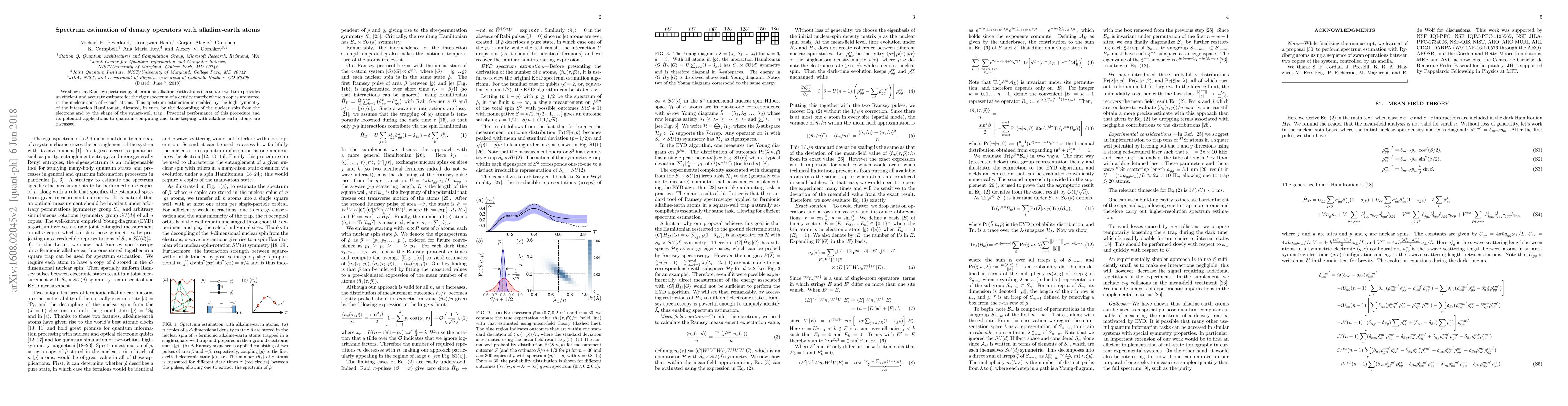 We show that Ramsey spectroscopy of fermionic alkaline-earth atoms in a square-well trap provides an efficient and accurate estimate for the eigenspectrum of a density matrix whose $n$ copies are stored in the nuclear spins of $n$ such atoms. This spectrum estimation is enabled by the high symmetry of the interaction Hamiltonian, dictated, in turn, by the decoupling of the nuclear spin from the electrons and by the shape of the square-well trap. Practical performance of this procedure and its potential applications to quantum computing, quantum simulation, and time-keeping with alkaline-earth atoms are discussed.