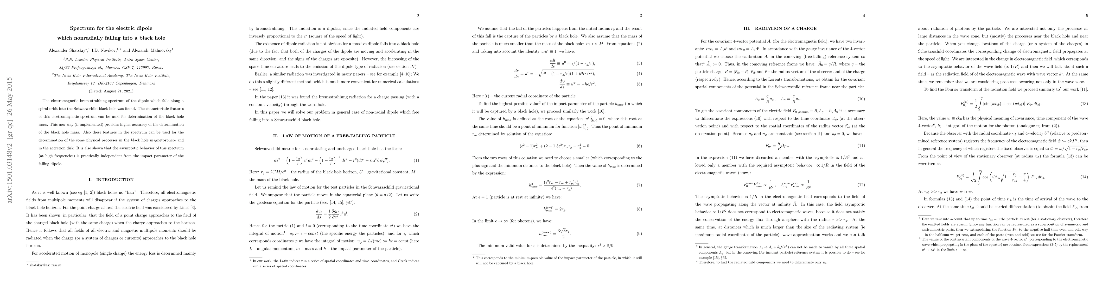 This paper investigates the electromagnetic spectrum generated by an electric dipole falling into a Schwarzschild black hole along a spiral orbit, revealing unique spectral features that can enhance the accuracy of black hole mass determination. These features also provide insights into the black hole's magnetosphere and accretion disk characteristics.