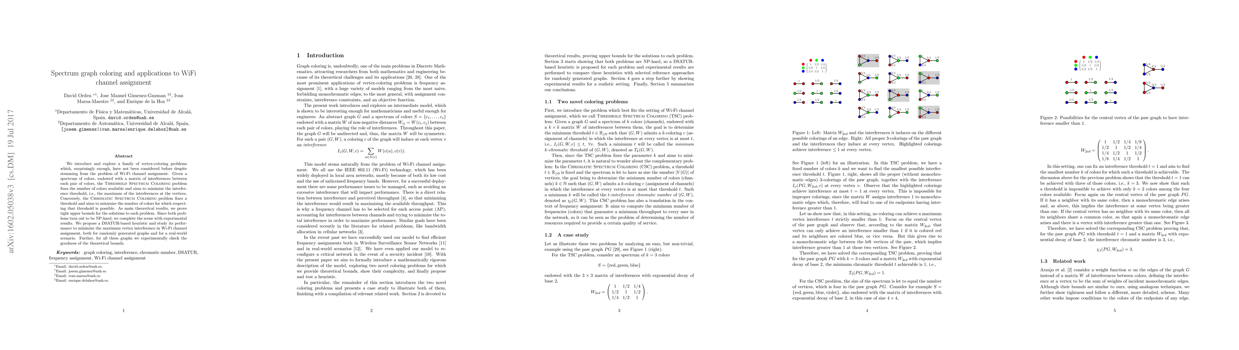 We introduce and explore a family of vertex-coloring problems which, surprisingly enough, have not been considered before despite stemming from the problem of Wi-Fi channel assignment. Given a spectrum of colors, endowed with a matrix of interferences between each pair of colors, the Threshold Spectrum Coloring problem fixes the number of colors available and aims to minimize the interference threshold, i.e., the maximum of the interferences at the vertices. Conversely, the Chromatic Spectrum Coloring problem fixes a threshold and aims to minimize the number of colors for which respecting that threshold is possible. As main theoretical results, we prove tight upper bounds for the solutions to each problem. Since both problems turn out to be NP-hard, we complete the scene with experimental results. We propose a DSATUR-based heuristic and study its performance to minimize the maximum vertex interference in Wi-Fi channel assignment, both for randomly generated graphs and for a real-world scenario. Further, for all these graphs we experimentally check the goodness of the theoretical bounds.