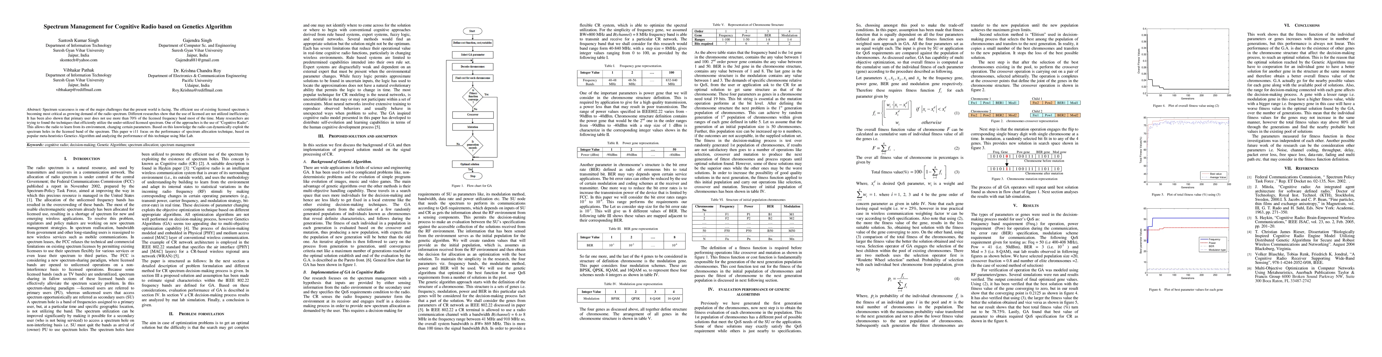 This paper explores the use of a Genetics Algorithm for optimizing spectrum allocation in Cognitive Radio systems to efficiently utilize under-utilized licensed spectrum. The performance of this technique is analyzed using MATLAB simulations.