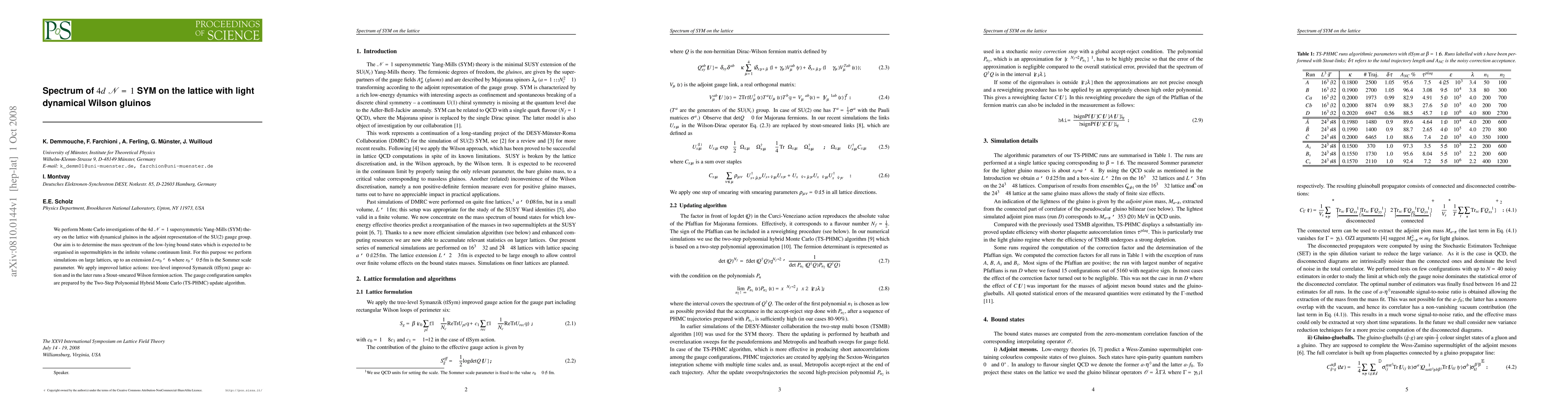 This paper investigates the mass spectrum of low-lying bound states in 4d N=1 supersymmetric Yang-Mills theory on the lattice using dynamical gluinos. Simulations employ improved lattice actions and large lattices to approach the continuum limit, with results expected to form supermultiplets.
