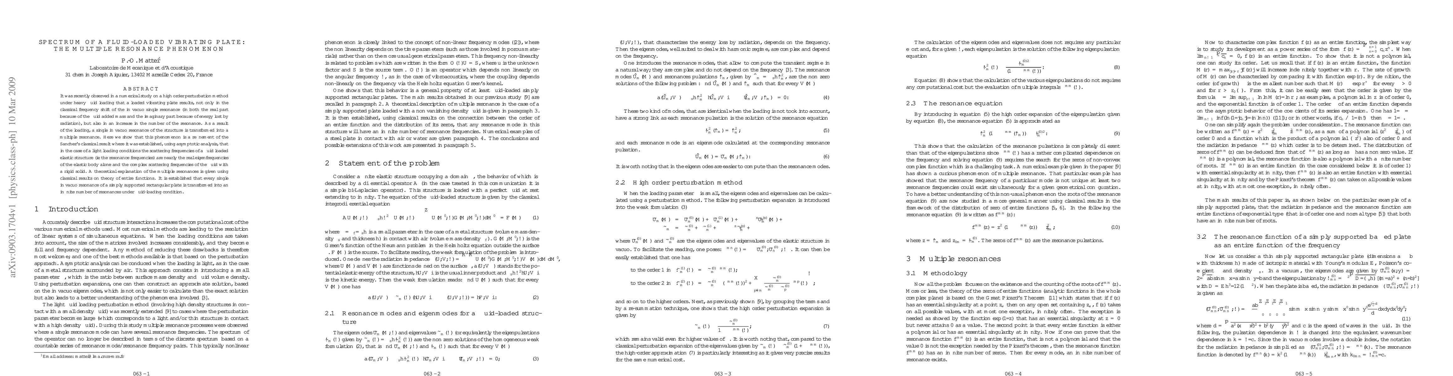 It was recently observed in a numerical study on a high order perturbation method under heavy fluid loading that a loaded vibrating plate results, not only in the classical frequency shift of the in vacuo single resonance (in both the real part because of the fluid added mass and the imaginary part because of energy lost by radiation), but also in an increase in the number of the resonance. As a result of the loading, a single in vacuo resonance of the structure is transformed into a multiple resonance. Here we show that this phenomenon is a refinement of the Sanchez's classical result where it was established, using asymptotic analysis, that in the case of a light loading conditions " the scattering frequencies of a fluid loaded elastic structure (ie the resonance frequencies) are nearly the real eigenfrequencies of the elastic body alone and the complex scattering frequencies of the fluid with a rigid solid ". A theoretical explanation of the multiple resonances is given using classical results on theory of entire functions. It is established that every single in vacuo resonance of a simply supported rectangular plate is transformed into an infinite number of resonances under fluid-loading condition.