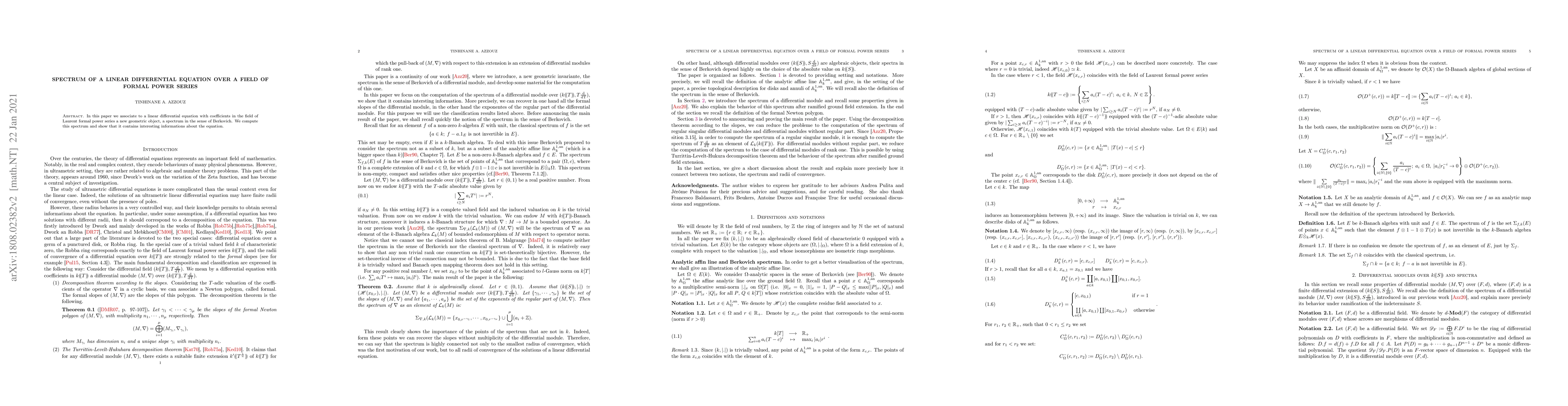 In this paper we associate to a linear differential equation with coefficients in the field of Laurent formal power series a new geometric object, a spectrum in the sense of Berkovich. We will compute this spectrum and show that it contains interesting informations about the equation.