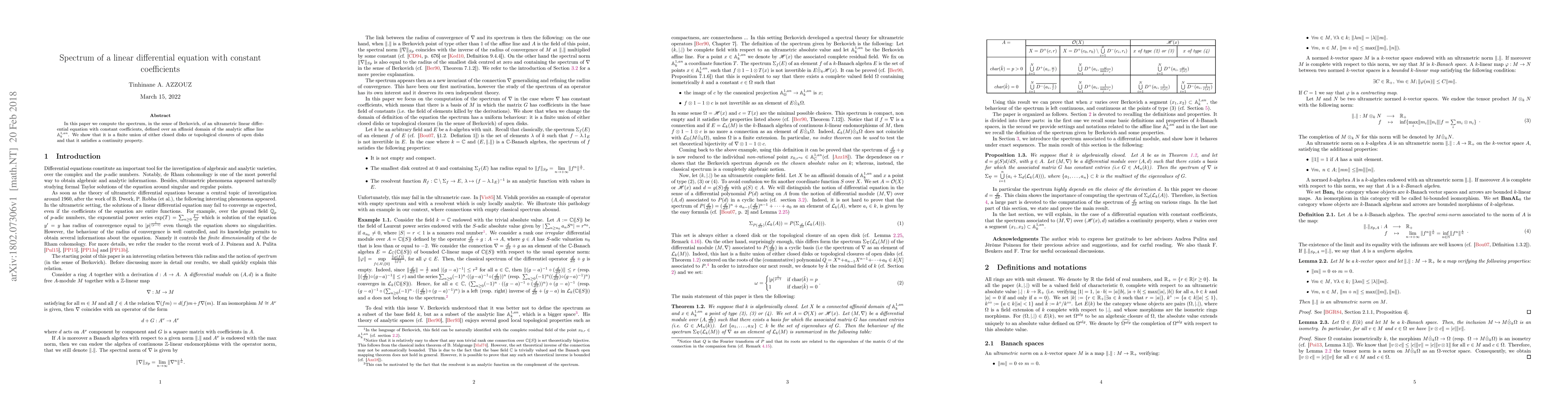 This paper computes the spectrum of an ultrametric linear differential equation with constant coefficients over an affinoid domain, finding it to be a finite union of closed disks or open disk closures, with a continuity property.