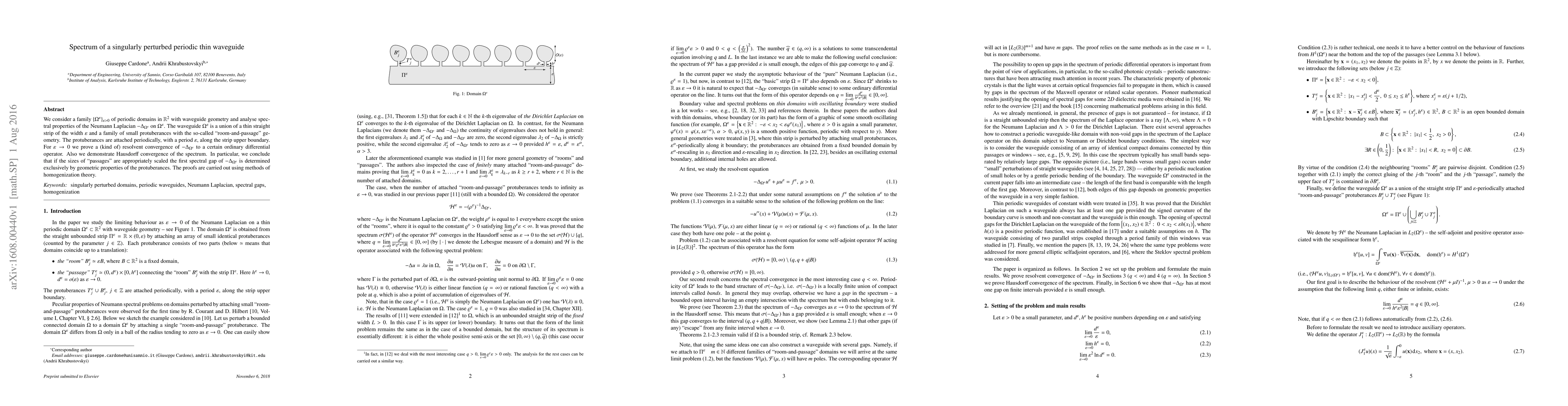 This paper investigates the spectral properties of a Neumann Laplacian in a periodically perturbed thin waveguide, proving resolvent convergence and Hausdorff convergence of the spectrum as the waveguide width approaches zero. The study concludes that the first spectral gap is primarily determined by the geometry of the periodic protuberances.
