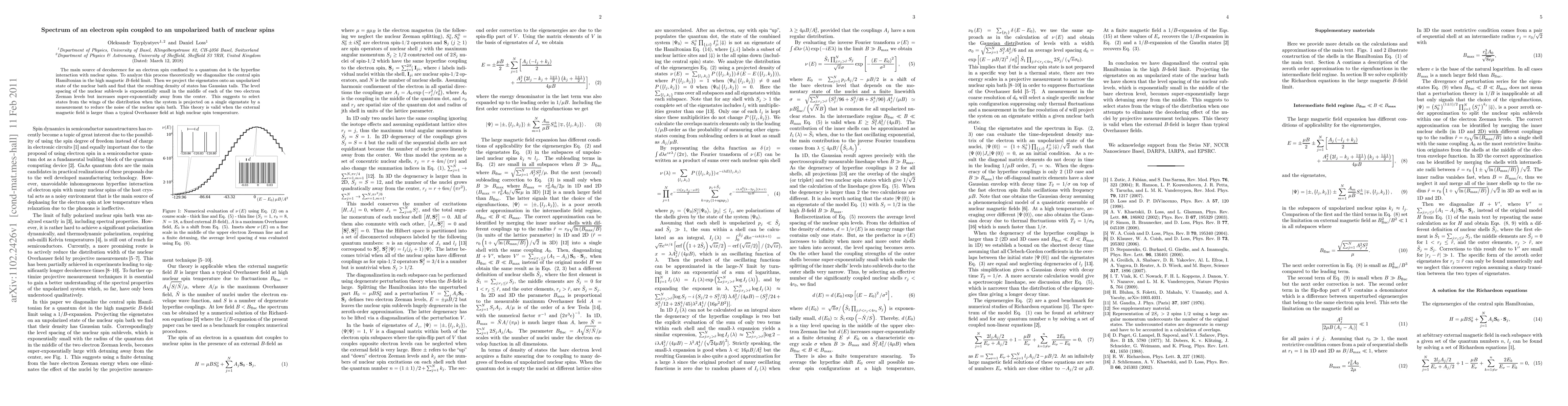 This paper investigates the decoherence of an electron spin in a quantum dot due to its hyperfine interaction with an unpolarized nuclear spin bath. Theoretical analysis reveals that the density of states has Gaussian tails, with level spacing exponentially small near the center but increasing super-exponentially away from it, suggesting reduced noise by selecting states from the distribution's wings.