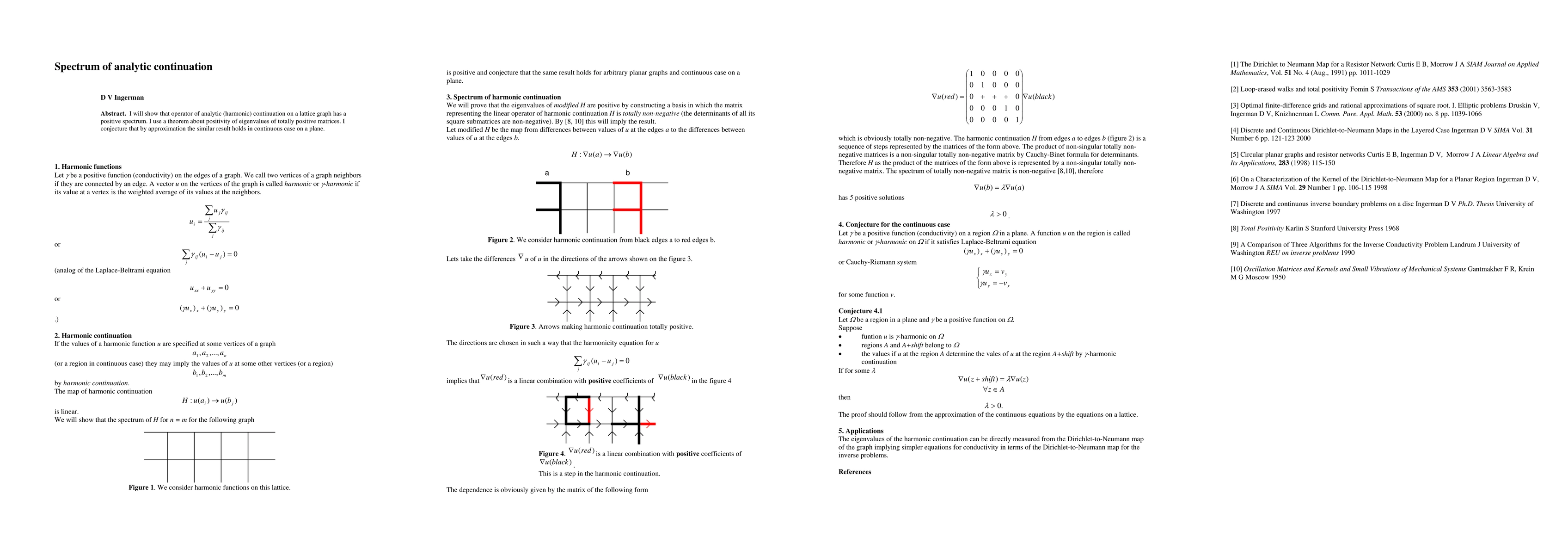 A study shows that the operator of analytic continuation on a lattice graph has a positive spectrum, implying that it can continue harmonic functions in a specific way. The authors conjecture that this result may hold for continuous cases on a plane by approximation.