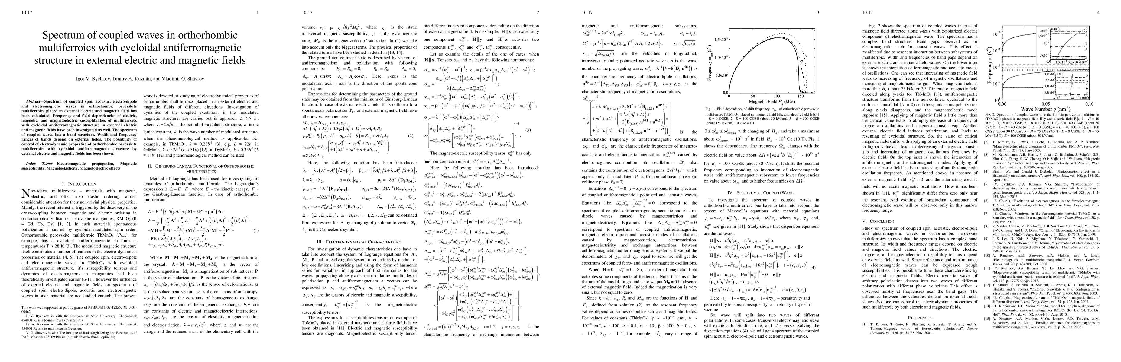 This research calculates the spectrum of coupled waves in orthorhombic multiferroics with cycloidal antiferromagnetic structure under external electric and magnetic fields, revealing a band structure dependent on field strength. It demonstrates the control of the material's electrodynamic properties via these external fields.