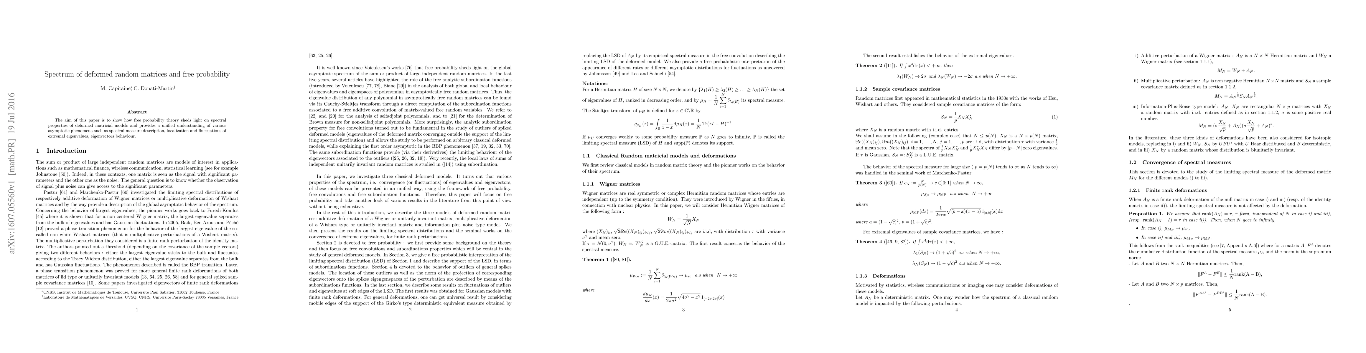 The aim of this paper is to show how free probability theory sheds light on spectral properties of deformed matricial models and provides a unified understanding of various asymptotic phenomena such as spectral measure description, localization and fluctuations of extremal eigenvalues, eigenvectors behaviour.