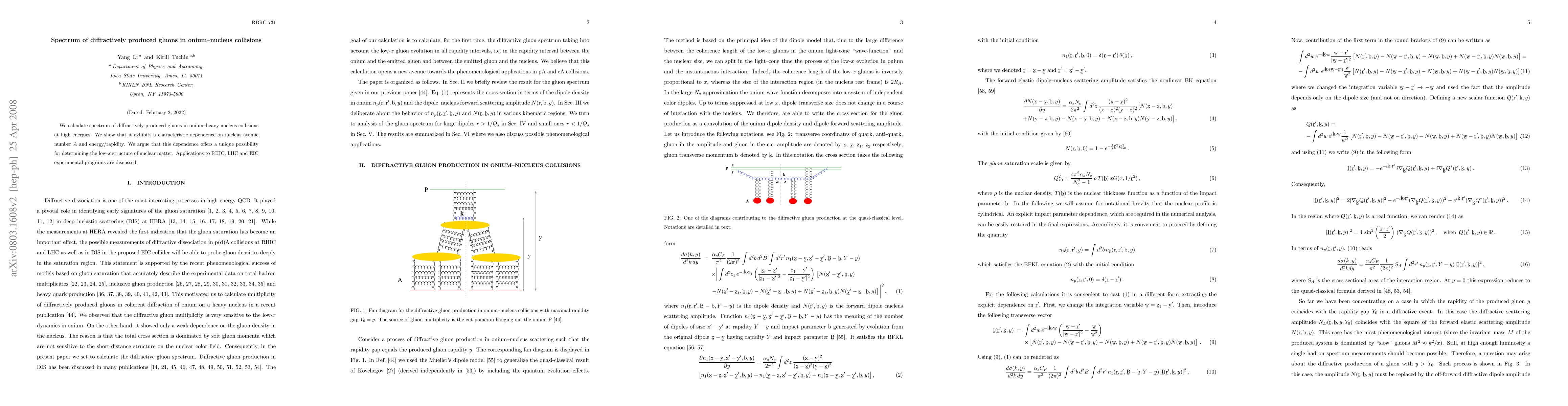 We calculate spectrum of diffractively produced gluons in onium-heavy nucleus collisions at high energies. We show that it exhibits a characteristic dependence on nucleus atomic number A and energy/rapidity. We argue that this dependence offers a unique possibility for determining the low-x structure of nuclear matter. Applications to RHIC, LHC and EIC experimental programs are discussed.