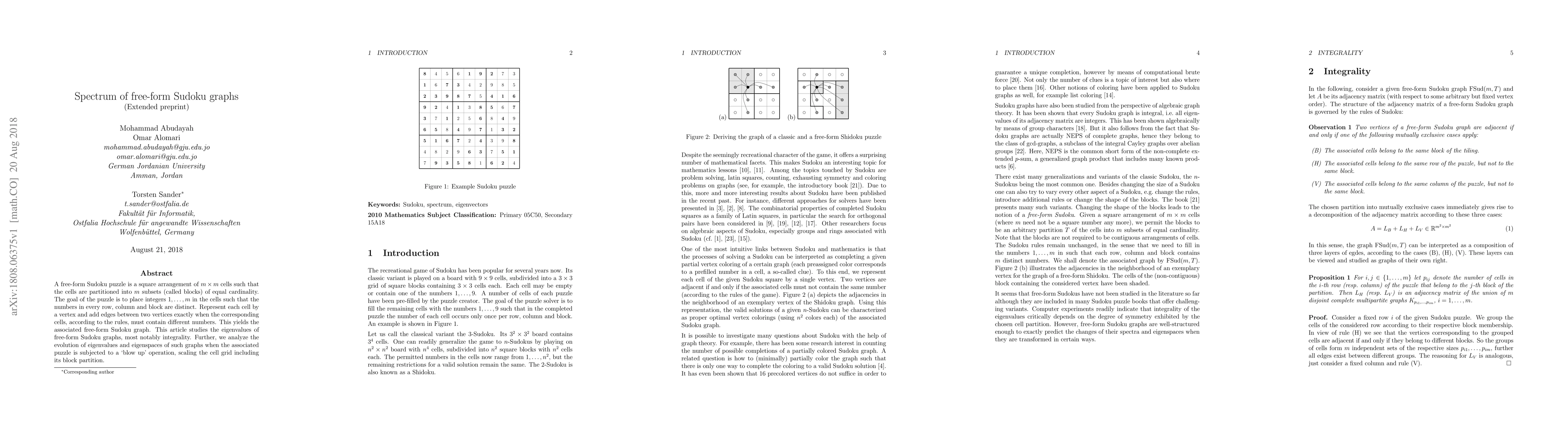 A free-form Sudoku puzzle is a square arrangement of m times m cells such that the cells are partitioned into m subsets (called blocks) of equal cardinality. The goal of the puzzle is to place integers 1,...,m in the cells such that the numbers in every row, column and block are distinct. Represent each cell by a vertex and add edges between two vertices exactly when the corresponding cells, according to the rules, must contain different numbers. This yields the associated free-form Sudoku graph. This article studies the eigenvalues of free-form Sudoku graphs, most notably integrality. Further, we analyze the evolution of eigenvalues and eigenspaces of such graphs when the associated puzzle is subjected to a "blow up" operation, scaling the cell grid including its block partition.
