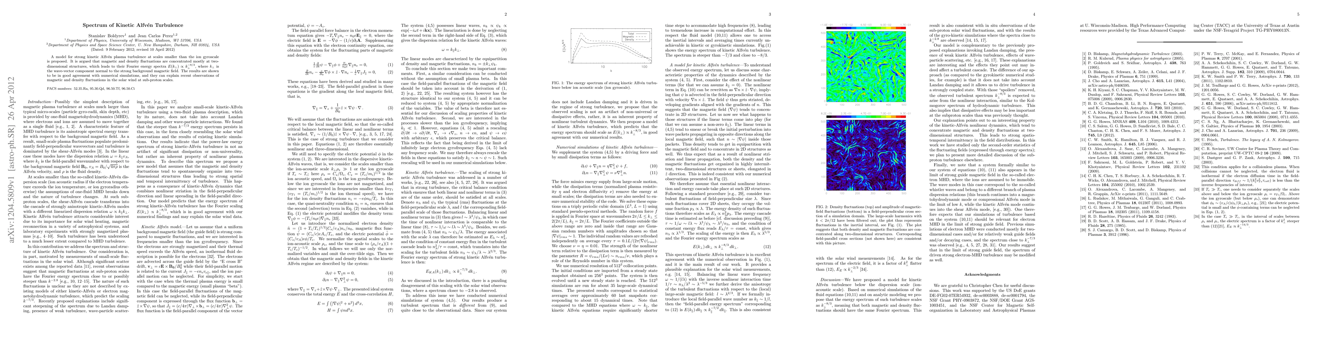 A model for strong kinetic Alfv\'en plasma turbulence at scales smaller than the ion gyroscale is proposed. It is argued that magnetic and density fluctuations are concentrated mostly at two-dimensional structures, which leads to their Fourier energy spectra $E(k_\perp)\propto k_{\perp}^{-8/3}$, where $k_\perp$ is the wave-vector component normal to the strong background magnetic field. The results are shown to be in good agreement with numerical simulations, and they can explain recent observations of magnetic and density fluctuations in the solar wind at sub-proton scales.