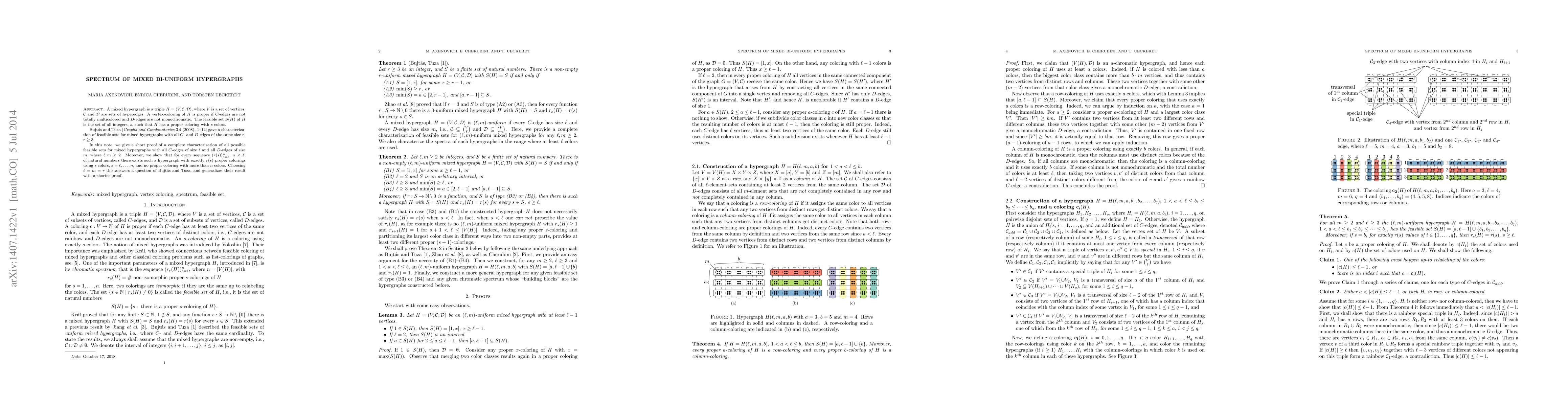 This paper provides a concise characterization of feasible sets for mixed hypergraphs with C-edges of size ℓ and D-edges of size m (ℓ, m ≥ 2), offering a shorter proof that generalizes previous work by Bujtás and Tuza. It also demonstrates the existence of hypergraphs with a specified number of proper colorings for any sequence of natural numbers.