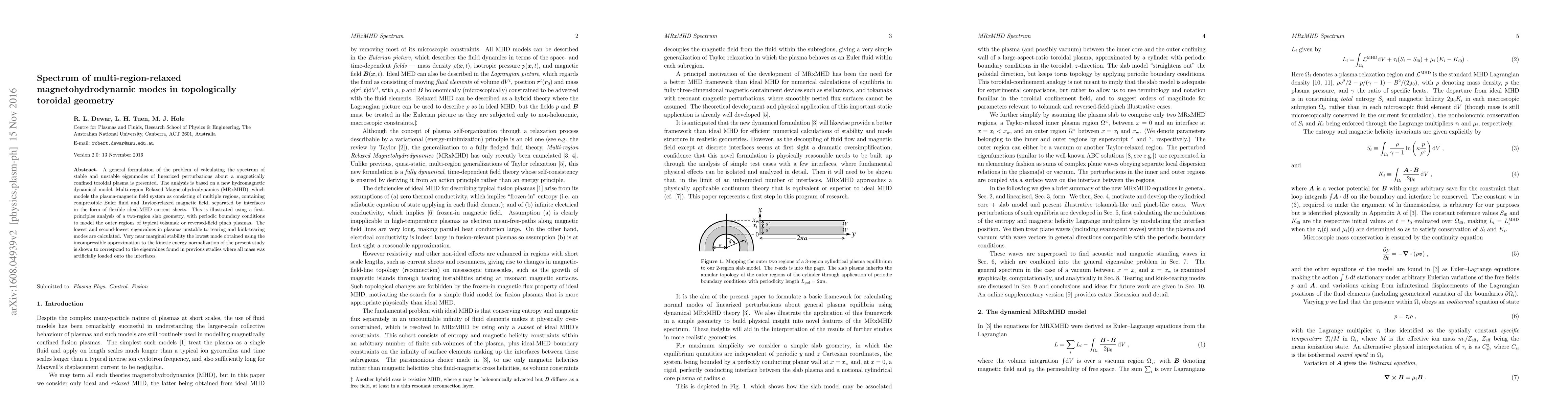 A general formulation of the problem of calculating the spectrum of stable and unstable eigenmodes of linearized perturbations about a magnetically confined toroidal plasma is presented. The analysis is based on a new hydromagnetic dynamical model, Multi-region Relaxed Magnetohydrodynamics (MRxMHD), which models the plasma-magnetic field system as consisting of multiple regions, containing compressible Euler fluid and Taylor-relaxed magnetic field, separated by flexible ideal-MHD current sheets. This is illustrated using a first-principles analysis of a two-region slab geometry, with periodic boundary conditions to model the outer regions of typical tokamak or reversed-field pinch plasmas. The lowest and second-lowest eigenvalues in plasmas unstable to tearing and kink-tearing modes are calculated. Very near marginal stability the lowest mode obtained using the incompressible approximation to the kinetic energy normalization of the present study is shown to correspond to the eigenvalues found in previous studies with less physical normalizations.