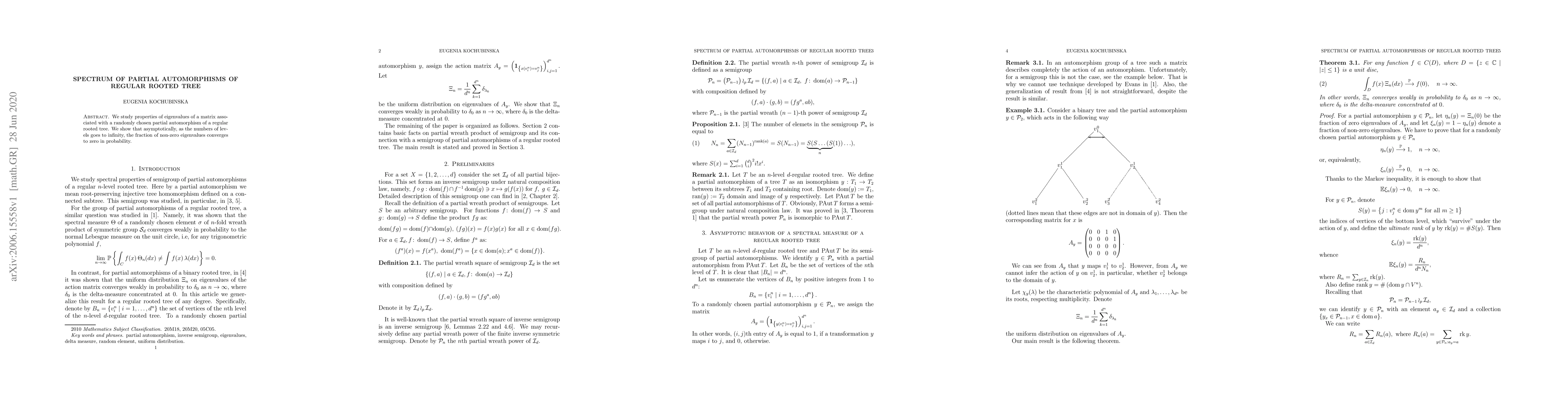 This paper investigates the eigenvalues of a matrix linked to randomly chosen partial automorphisms of a regular rooted tree, demonstrating that the proportion of non-zero eigenvalues tends to zero as the tree's levels grow infinitely.