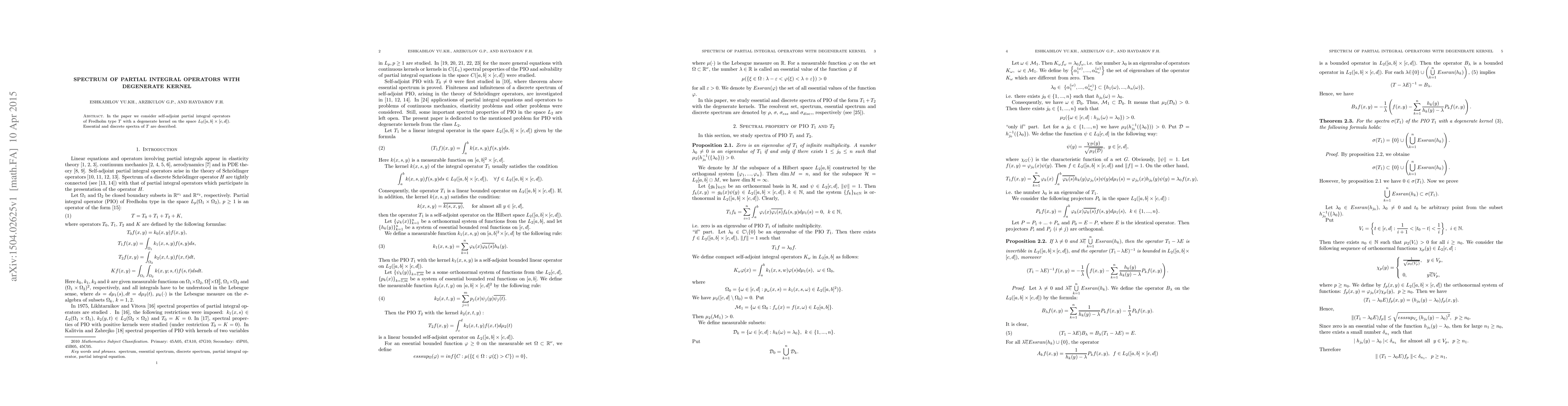 This paper investigates self-adjoint partial integral operators $T$ of Fredholm type with degenerate kernels on $L_2([a,b]\times[c,d])$, providing a detailed description of both the essential and discrete spectra of $T$.
