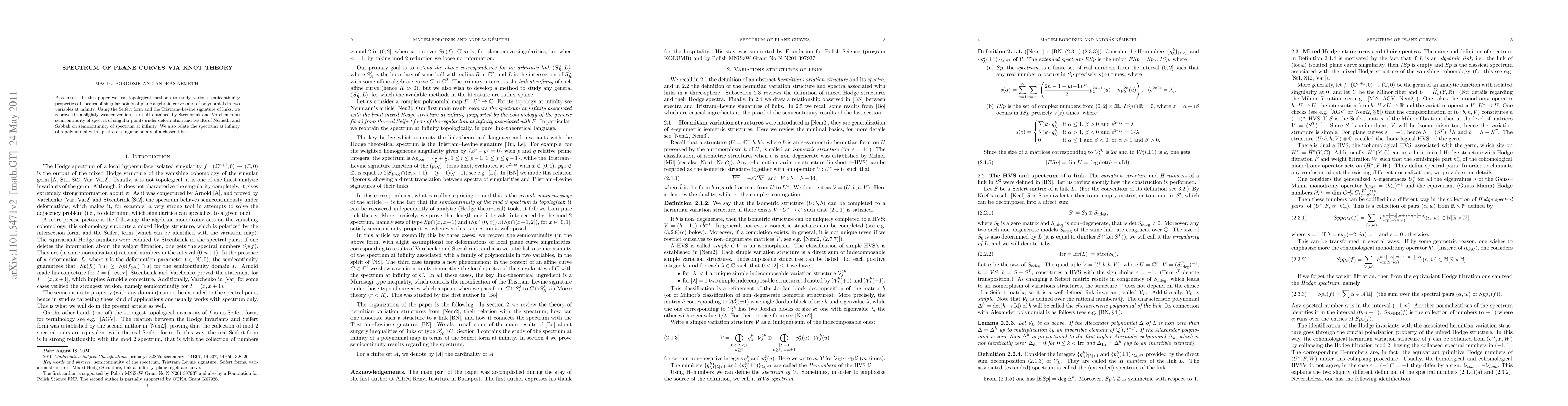 Researchers use knot theory to study the properties of plane curves, proving a weaker version of a previous result on semicontinuity of spectra at infinity. They also find connections between these spectra and those of singular points of other curves.