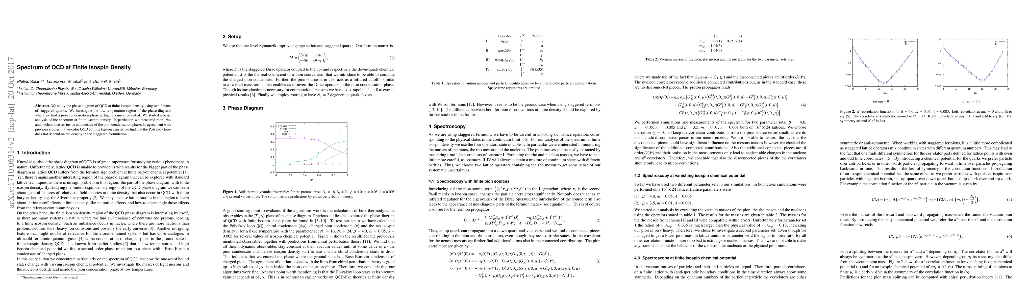This study examines the QCD phase diagram at finite isospin density using staggered quarks, identifying a pion condensation phase at high chemical potential and analyzing the masses of pions, rho mesons, and nucleons within and outside this phase. The Polyakov loop's density independence aligns with prior findings in two-color QCD.