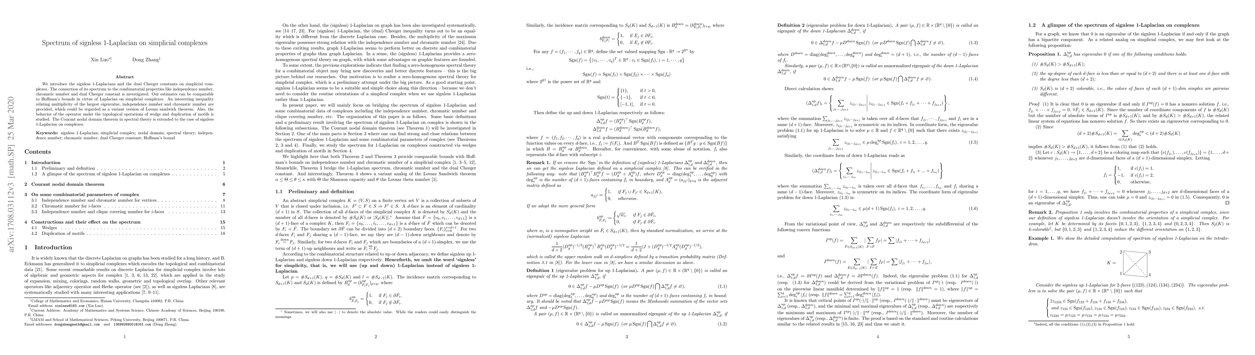 The research introduces signless 1-Laplacians and dual Cheeger constants on simplicial complexes, connecting their spectrum to combinatorial properties like independence number, chromatic number, and dual Cheeger constant. The study also extends the Courant nodal domain theorem in spectral theory to the case of signless 1-Laplacian on complexes.