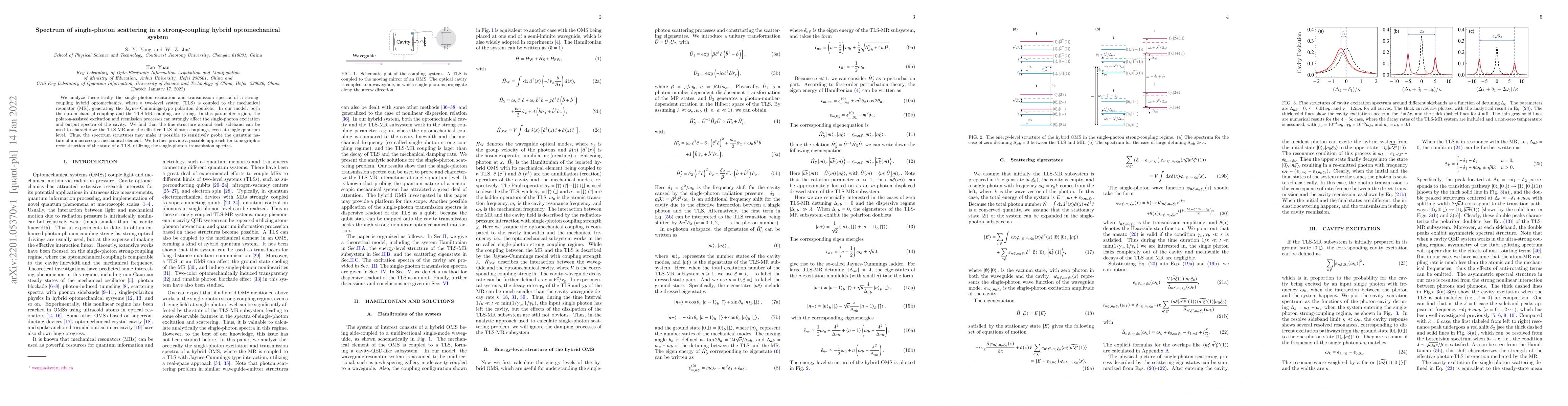 This paper theoretically investigates the single-photon scattering spectra in a strong-coupling hybrid optomechanical system, revealing the fine structure around sidebands that characterizes the interactions between a two-level system and a mechanical resonator. The study proposes a method for reconstructing the state of the two-level system using single-photon transmission spectra.