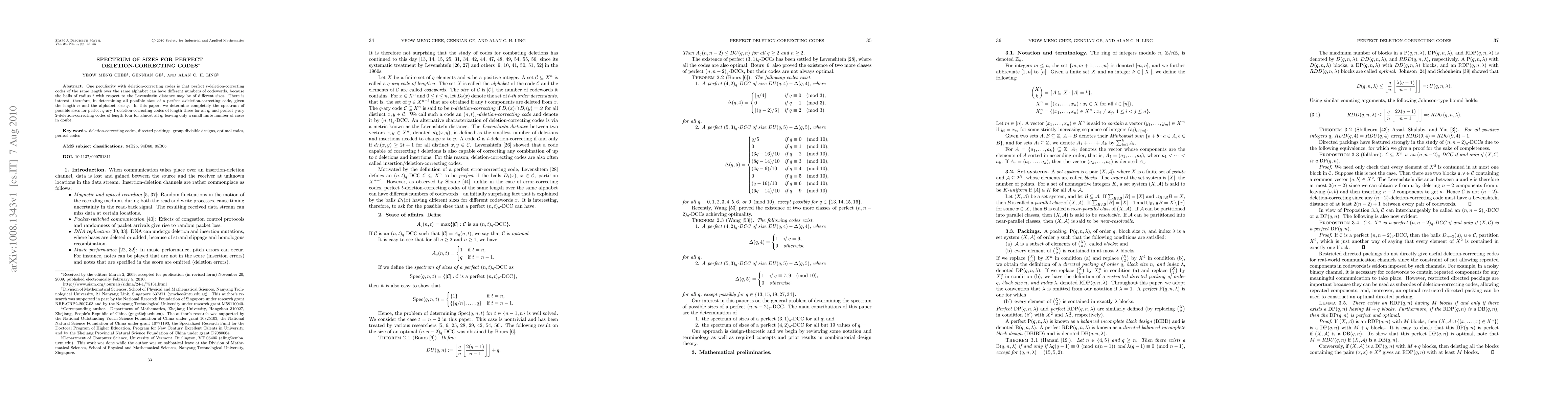 This paper explores the spectrum of sizes for perfect deletion-correcting codes, determining all possible sizes for perfect 1-deletion-correcting codes of length three and 2-deletion-correcting codes of length four for almost all alphabet sizes, with only a few cases remaining unresolved.