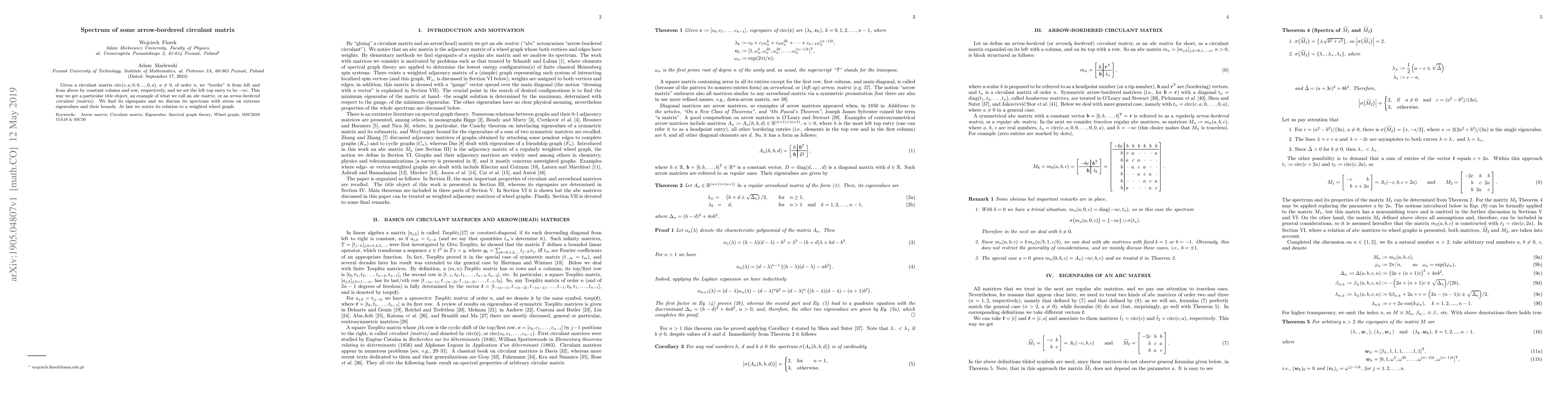 Given a circulant matrix $\mathrm{circ}(c,a,0,0,...,0,a)$, $a\ne 0$, of order~$n$, we ``border'' it from left and from above by constant column and row, respectively, and we set the left top entry to be $-nc$. This way we get a~particular title object, an example of what we call an \textit{abc matrix\/}, or an \textit{arrow-bordered circulant (matrix)\/}. We find its eigenpairs and we discuss its spectrum with stress on extreme eigenvalues and their bounds. At last we notice its relation to a~weighted wheel graph