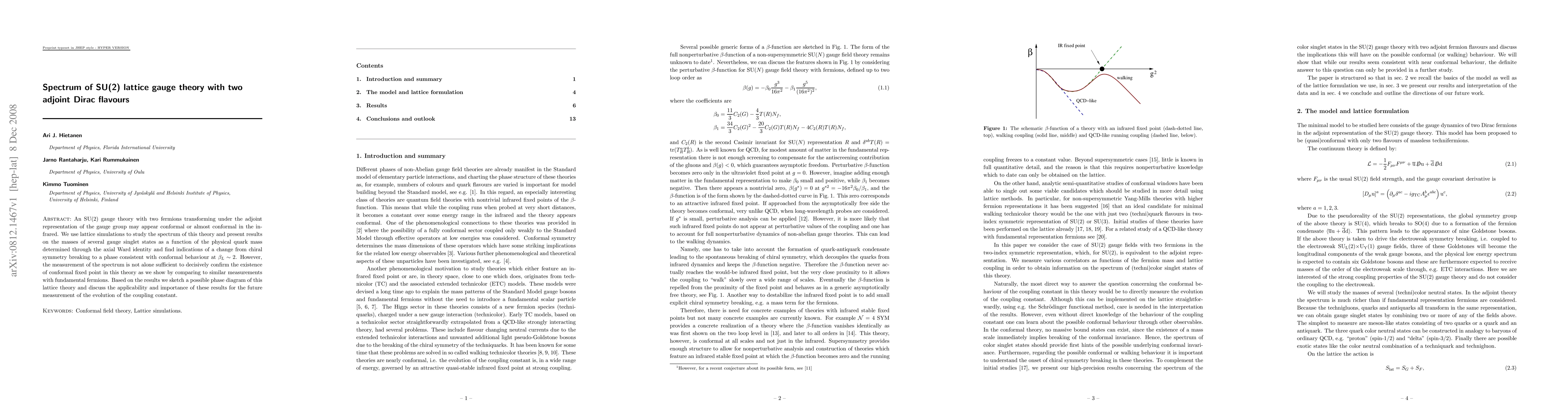 An SU(2) gauge theory with two fermions transforming under the adjoint representation of the gauge group may appear conformal or almost conformal in the infrared. We use lattice simulations to study the spectrum of this theory and present results on the masses of several gauge singlet states as a function of the physical quark mass determined through the axial Ward identity and find indications of a change from chiral symmetry breaking to a phase consistent with conformal behaviour at beta_L ~ 2. However, the measurement of the spectrum is not alone sufficient to decisively confirm the existence of conformal fixed point in this theory as we show by comparing to similar measurements with fundamental fermions. Based on the results we sketch a possible phase diagram of this lattice theory and discuss the applicability and importance of these results for the future measurement of the evolution of the coupling constant.