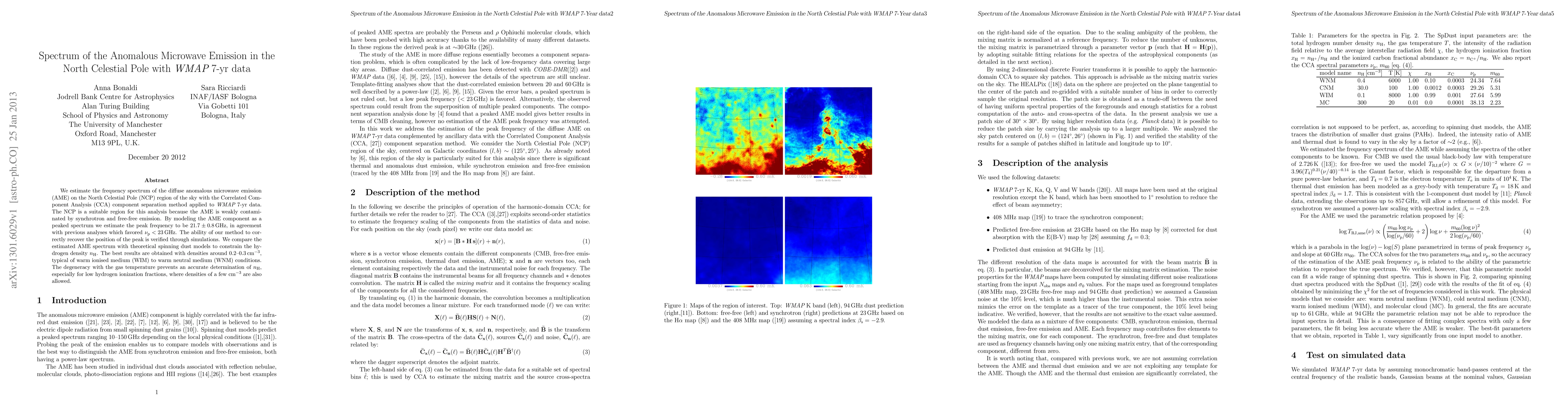 This paper analyzes the spectrum of the anomalous microwave emission (AME) in the North Celestial Pole region using WMAP 7-year data and the CCA method, finding a peak frequency of $21.7\pm0.8$ GHz. The study compares the AME spectrum with spinning dust models, suggesting hydrogen densities around 0.2--0.3 cm$^{-3}$, typical of the warm ionized medium to warm neutral medium.
