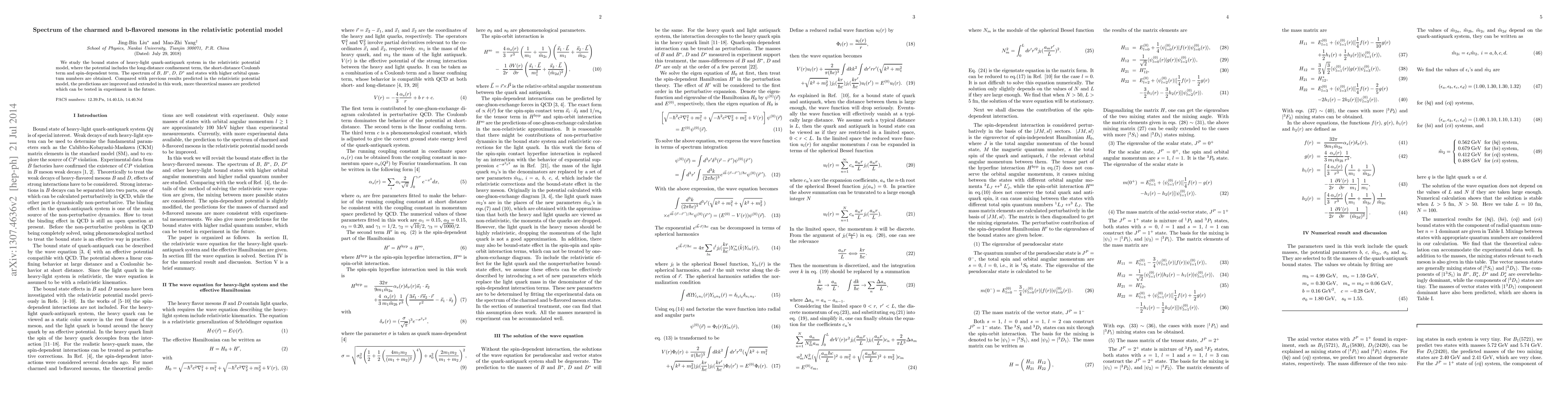 We study the bound states of heavy-light quark-antiquark system in the relativistic potential model, where the potential includes the long-distance confinement term, the short-distance Coulomb term and spin-dependent term. The spectrum of $B$, $B^*$, $D$, $D^*$ and states with higher orbital quantum numbers are obtained. Compared with previous results predicted in the relativistic potential model, the predictions are improved and extended in this work, more theoretical masses are predicted which can be tested in experiment in the future.