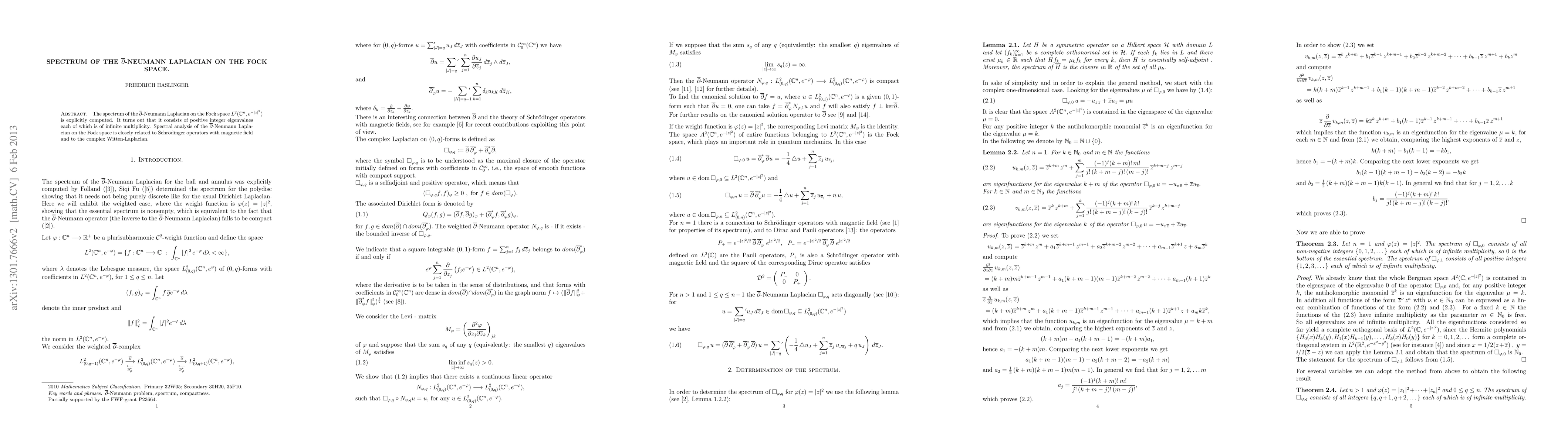 The paper computes the spectrum of the d-bar-Neumann Laplacian on the Fock space, revealing positive integer eigenvalues of infinite multiplicity. This spectral analysis connects to Schrödinger operators with magnetic fields and the complex Witten-Laplacian.