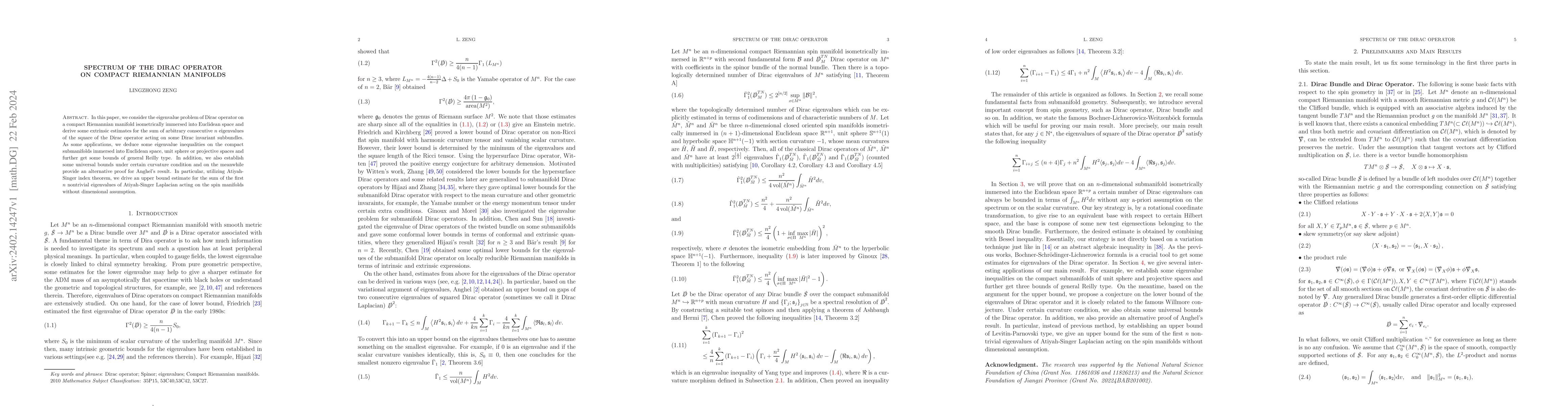 This paper investigates the eigenvalue problem of the Dirac operator on compact Riemannian manifolds immersed in Euclidean space, deriving extrinsic estimates for sums of consecutive eigenvalues and establishing Reilly-type bounds. It also provides an alternative proof for Anghel's result and an upper bound for the first $n$ nontrivial eigenvalues of Atiyah-Singer Laplacian on spin manifolds.