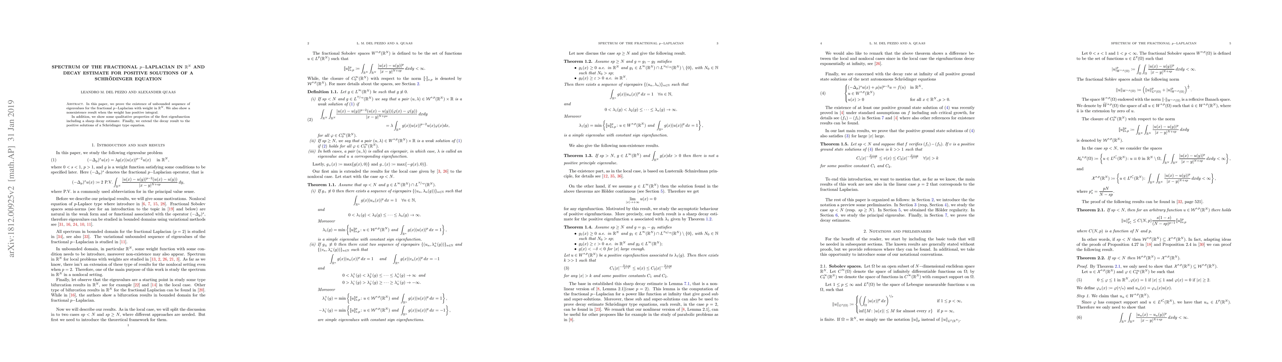 This paper establishes the existence of an unbounded sequence of eigenvalues for the fractional $p-$Laplacian with weight in $\mathbb{R}^N$ and proves nonexistence when the weight has positive integral. It also provides a sharp decay estimate for the first eigenfunction and extends this decay to positive solutions of a Schrödinger type equation.