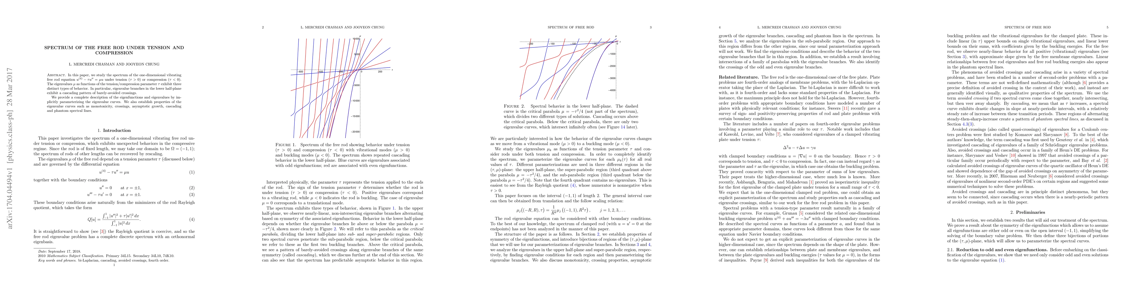 In this paper, we study the spectrum of the one-dimensional vibrating free rod equation $u^{(4)}-\tau u"=\mu u$ under tension $(\tau>0)$ or compression $(\tau<0)$. The eigenvalues $\mu$ as functions of the tension/compression parameter $\tau$ exhibit three distinct types of behavior. In particular, eigenvalue branches in the lower half-plane exhibit a cascading pattern of barely-avoided crossings. We provide a complete description of the eigenfunctions and eigenvalues by implicitly parameterizing the eigenvalue curves. We also establish properties of the eigenvalue curves such as monotonicity, crossings, asymptotic growth, cascading and phantom spectral lines.