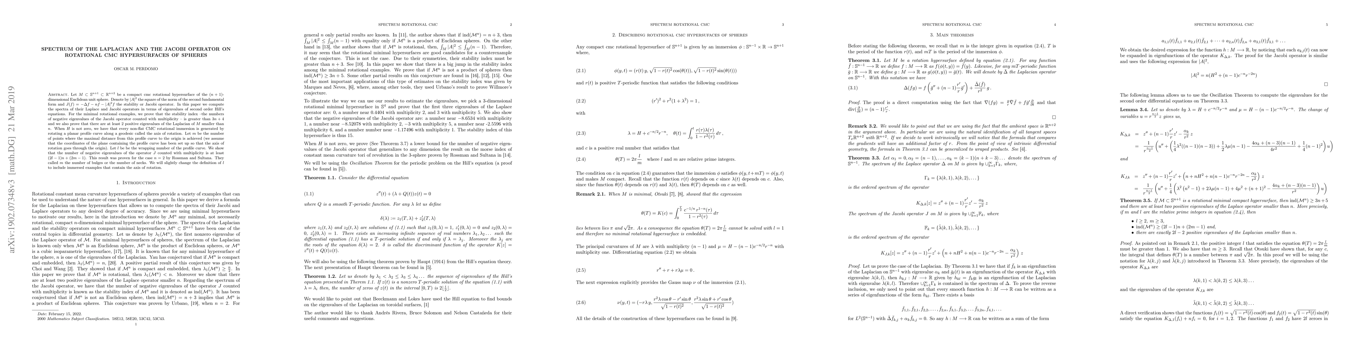 This paper computes the spectra of the Laplace and Jacobi operators for rotational constant mean curvature (CMC) hypersurfaces in spheres, relating them to eigenvalues of second-order Hill's equations. It proves that the stability index of minimal rotational examples exceeds $3n+4$ and shows at least 2 positive eigenvalues for the Laplacian. For non-zero mean curvature cases, it establishes a lower bound for the negative eigenvalues of the Jacobi operator based on the profile curve's geometry.