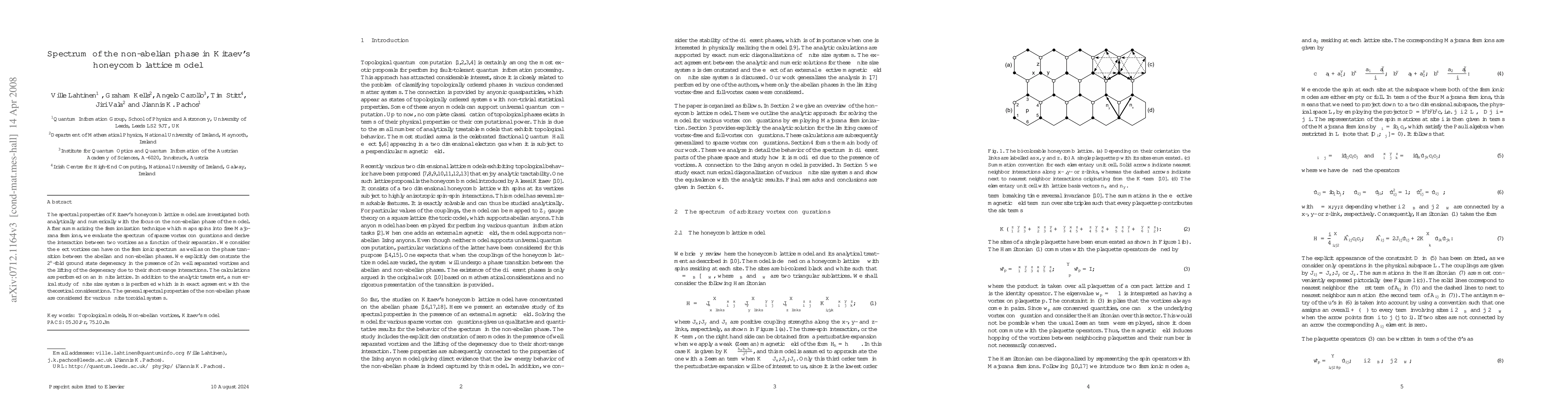This paper investigates the spectral properties of Kitaev's honeycomb lattice model, particularly focusing on the non-abelian phase, using both analytical and numerical methods. It demonstrates the $2^n$-fold ground state degeneracy in the presence of $2n$ separated vortices and explains the lifting of this degeneracy through their interactions.