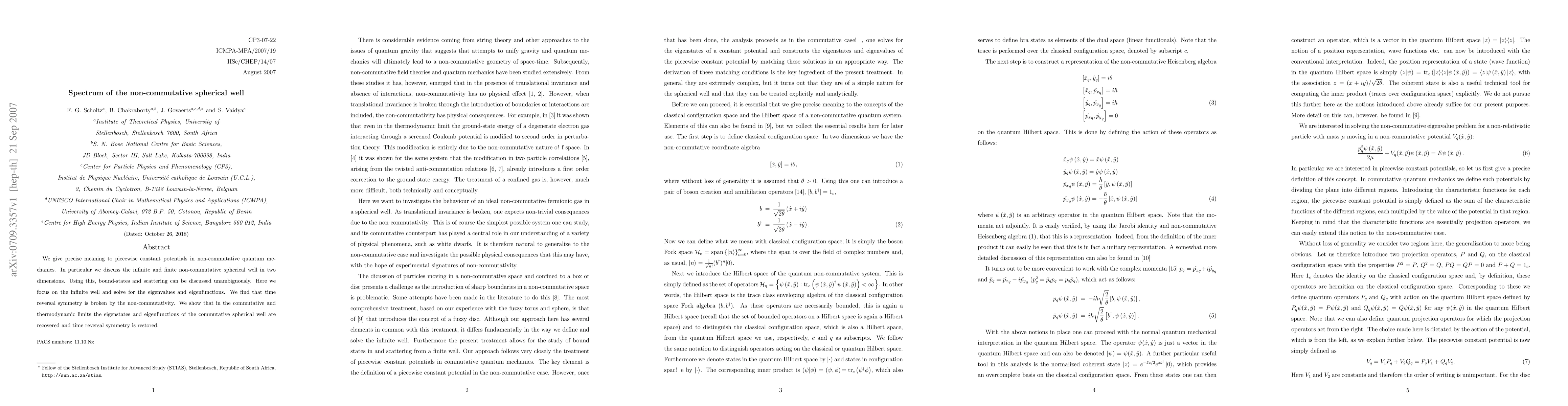 We give precise meaning to piecewise constant potentials in non-commutative quantum mechanics. In particular we discuss the infinite and finite non-commutative spherical well in two dimensions. Using this, bound-states and scattering can be discussed unambiguously. Here we focus on the infinite well and solve for the eigenvalues and eigenfunctions. We find that time reversal symmetry is broken by the non-commutativity. We show that in the commutative and thermodynamic limits the eigenstates and eigenfunctions of the commutative spherical well are recovered and time reversal symmetry is restored.