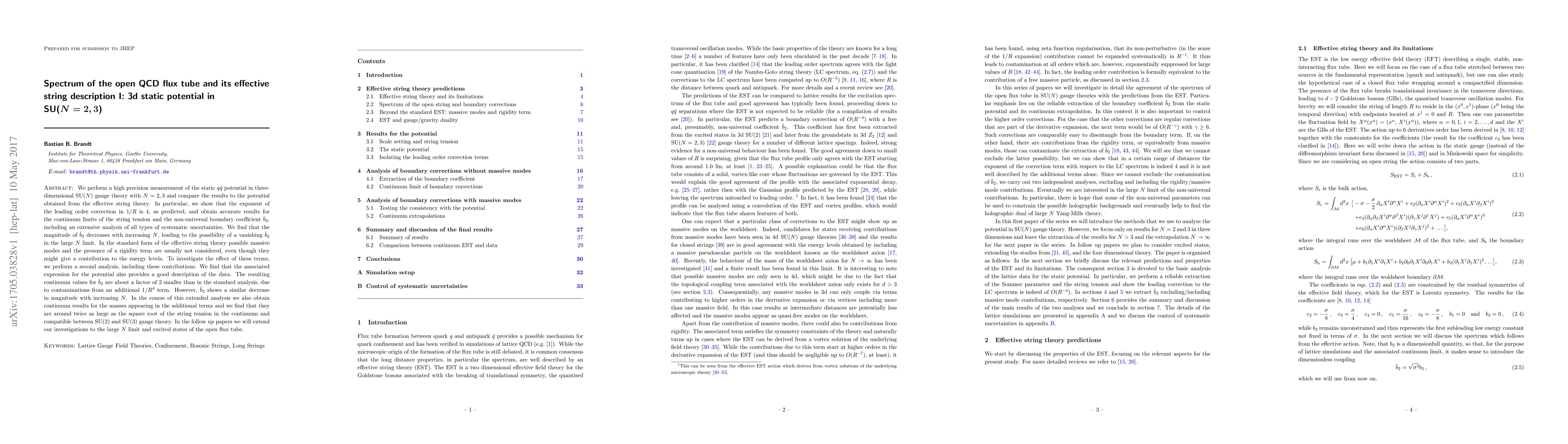 We perform a high precision measurement of the static $q\bar{q}$ potential in three-dimensional SU($N$) gauge theory with $N=2,3$ and compare the results to the potential obtained from the effective string theory. In particular, we show that the exponent of the leading order correction in $1/R$ is 4, as predicted, and obtain accurate results for the continuum limits of the string tension and the non-universal boundary coefficient $\bar{b}_2$, including an extensive analysis of all types of systematic uncertainties. We find that the magnitude of $\bar{b}_2$ decreases with increasing $N$, leading to the possibility of a vanishing $\bar{b}_2$ in the large $N$ limit. In the standard form of the effective string theory possible massive modes and the presence of a rigidity term are usually not considered, even though they might give a contribution to the energy levels. To investigate the effect of these terms, we perform a second analysis, including these contributions. We find that the associated expression for the potential also provides a good description of the data. The resulting continuum values for $\bar{b}_2$ are about a factor of 2 smaller than in the standard analysis, due to contaminations from an additional $1/R^4$ term. However, $\bar{b}_2$ shows a similar decrease in magnitude with increasing $N$. In the course of this extended analysis we also obtain continuum results for the masses appearing in the additional terms and we find that they are around twice as large as the square root of the string tension in the continuum and compatible between SU(2) and SU(3) gauge theory. In the follow up papers we will extend our investigations to the large $N$ limit and excited states of the open flux tube.