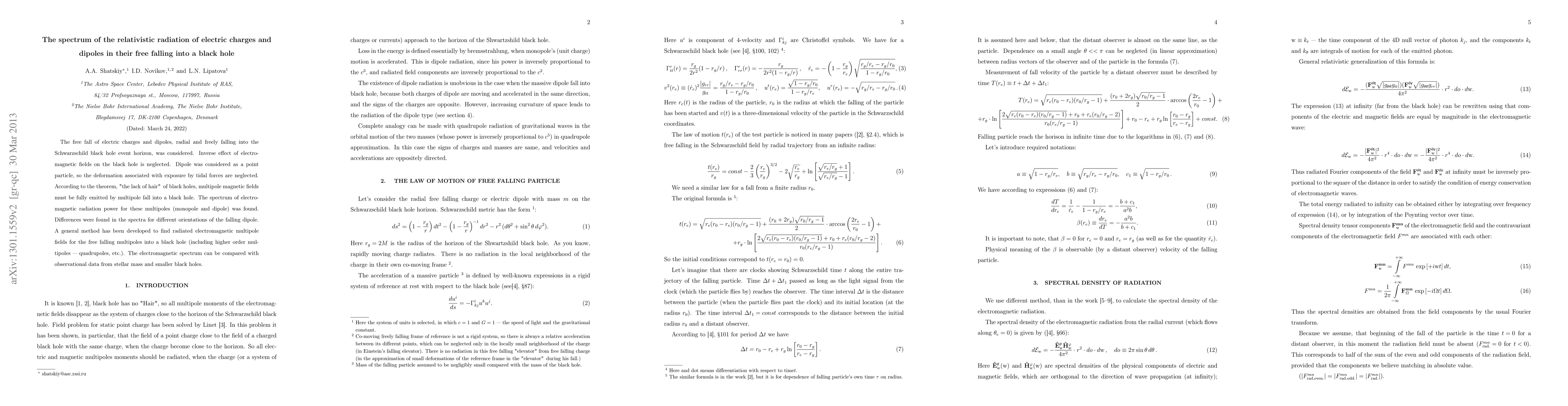 The free fall of electric charges and dipoles, radial and freely falling into the Schwarzschild black hole event horizon, was considered. Inverse effect of electromagnetic fields on the black hole is neglected. Dipole was considered as a point particle, so the deformation associated with exposure by tidal forces are neglected. According to the theorem, "the lack of hair" of black holes, multipole magnetic fields must be fully emitted by multipole fall into a black hole. The spectrum of electromagnetic radiation power for these multipoles (monopole and dipole) was found. Differences were found in the spectra for different orientations of the falling dipole. A general method has been developed to find radiated electromagnetic multipole fields for the free falling multipoles into a black hole (including higher order multipoles - quadrupoles, etc.). The electromagnetic spectrum can be compared with observational data from stellar mass and smaller black holes.